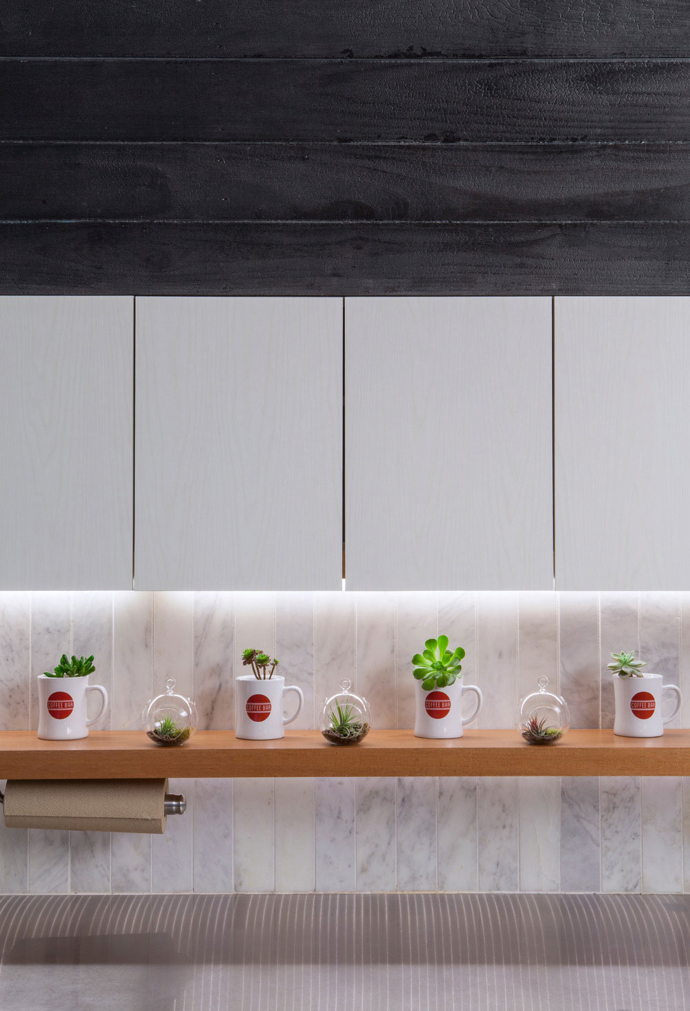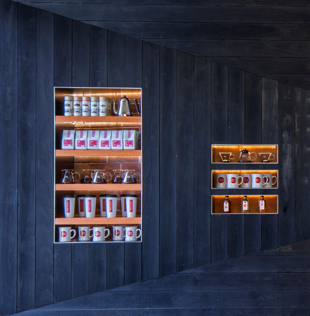 Vďaka japonskej technike páleného dreva Shou Sugi Ban sa vo vonkajších aj vnútorných priestoroch nachádza originálny a odolný obklad. Fasáda je riešená postupným farebným prechodom od prírodnej farby až po čiernu prostredníctvom jednotlivých vrstiev rozlične opáleného dreva. Na ľavej strane čierne drevo zasahuje až do interiéru, kde slúži ako dizajnová báza obloženia, ale aj ako základ funkčných prvkov interiéru – police či baristický pult. Dômyselné spojenie čierneho dreva s pohľadovým betónom, bielou omietkou a jednoduchým zariadením vytvára jednoliaty vizuál, ktorý veľmi príjemne podčiarkuje funkčnosť a prívetivú atmosféru kaviarne.