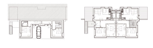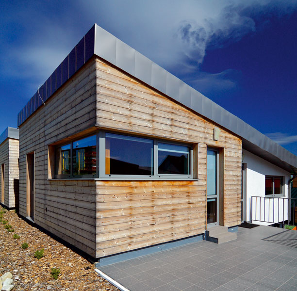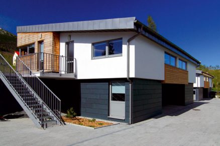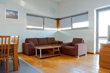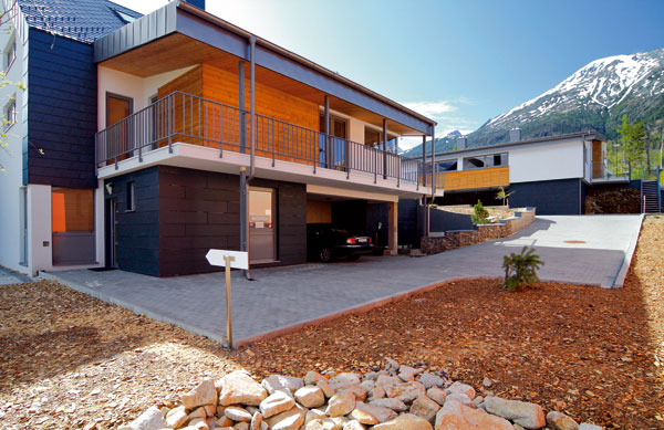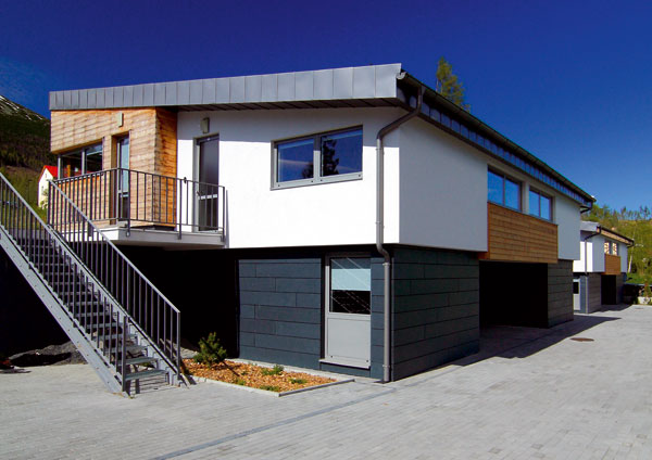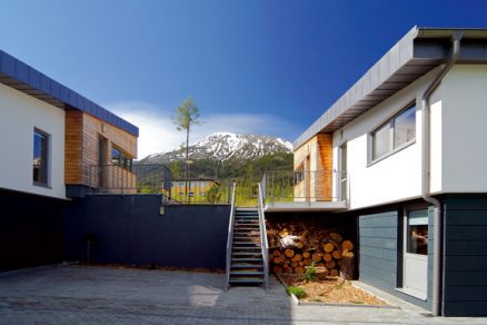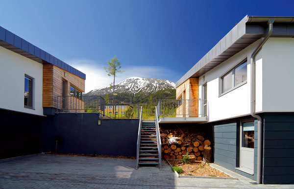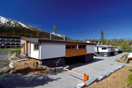 Podmienky pozemku nám v tom však zabránili, a preto sme museli celú dispozíciu otočiť,“ ozrejmuje projektové zmeny architekt. Vstupná časť sa umiestnila na prvé podlažie a spolu so spálňami na druhom podlaží získala južnú orientáciu. Spoločenská časť apartmánov s obývačkou a kuchyňou sa tak ocitla na severnej strane s výhľadom na Slavkovský štít. V jeho podnoží sa však ukrýva množstvo podpovrchových vôd, preto sa objekty osadili na zatĺkané mikropilóty a oporný múr areálu sa vybavil drenážnym systémom na prepúšťanie vody. Podzemný tok dokonca viedol priamo pod jedným z objektov, preto ho museli odkloniť pomocou potrubia.