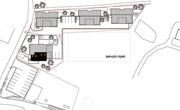 Terén, na ktorom sa malo stavať, bol po osudnej kalamite spred piatich rokov úplne zdevastovaný. Navyše ho narúšal terénny zlom, ktorý v spodnej časti pozemku vytváral jamu zvažujúcu sa k bývalým tenisovým kurtom. Základnou otázkou teda zostávalo, akým spôsobom sa architekti vyrovnajú so stavebno-technickými ťažkosťami parcely a súčasne nájdu riešenie investorovho zámeru. Našťastie, aj túto nevýhodu dokázali architekti zúročiť v prospech ubytovacieho strediska. Celý zlom sa podoprel oporným múrom, ktorý sa stal súčasťou objektov. Pre jeho výšku zodpovedajúcu jednému podlažiu architekti navrhli objekty, ktoré sa z jednej strany javia ako jednopodlažné, zatiaľ čo z opačného pohľadu sú dvojpodlažné. „Pôvodne sme chceli orientovať vstupy do objektov zo severnej strany, teda zhora, čo bolo nakoniec najprirodzenejšie riešenie.