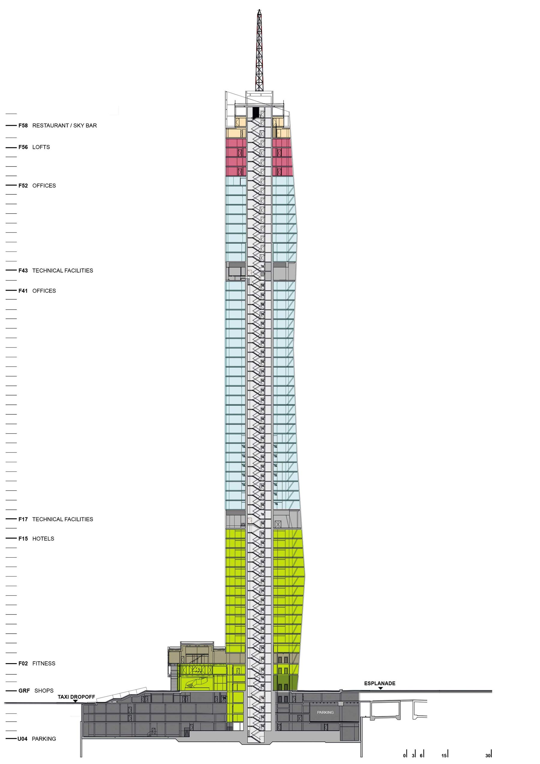 Pre Dominiqua Perraulta (nar. 1953) bolo výzvou spojenie horizontálnych a vertikálnych častí v mestskej štvrti Viedne vo veľkej mierke. Vopred odmietol prvoplánovo okázalý kontrast medzi vertikálnou fasádou a poschodiami členenými umelými terasami. „Chceli sme vybudovať špecifickú topografiu povrchu fasády, ktorá by harmonizovala s neďalekým Dunajom,“ približuje Perrault. „Nekĺzali sme sa po jej povrchu, išlo nám o zachytenie tekutosti, čiže pohybu, ktorý by bol odrazom okolitého života. Vežu by som prirovnal k stromu s koreňmi. Strom je zaujímavý, ak v ňom vidíte pohybujúce sa výťahy, ale je ešte pôsobivejší, ak v ňom cítite aj jeho korene. Aj preto môj prístup začína od krajiny, pokračuje urbanistickou stratégiou v okolitom kontexte a nakoniec sa končí samotnou budovou. V takejto postupnosti je možné všetko a veľkosť už nie je problémovou otázkou…“ DC Tower 1 má 60 nadzemných podlaží, ktoré obsahujú 93 600 štvorcových metrov podlahovej plochy. Na spodných 15 podlažiach bude štvorhviezdičkový Hotel Meliă Vienna s 255 izbami, ďalšie podlažia ponúknu 66 000 štvorcových metrov kancelárskej plochy, z ktorej je už vyše polovica obsadená. Na vrchných podlažiach – od 52. po 56. poschodie – je 32 loftových bytov a na 58. poschodí čaká návštevníkov highlight v podobe reštaurácie a Sky baru s panoramatickým výhľadom. Podzemie má 44 000 štvorcových metrov, ktorých podstatnú časť tvorí 570 parkovacích miest.