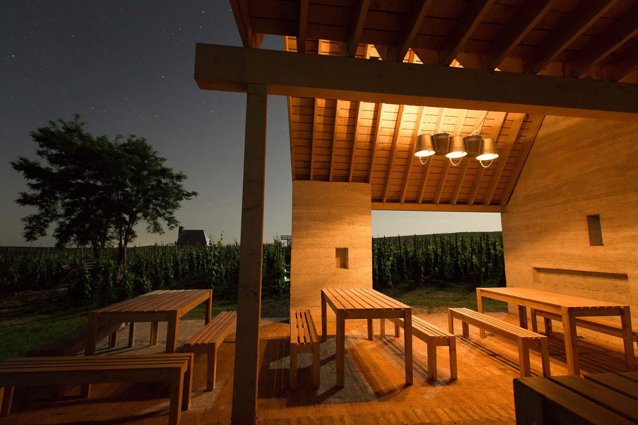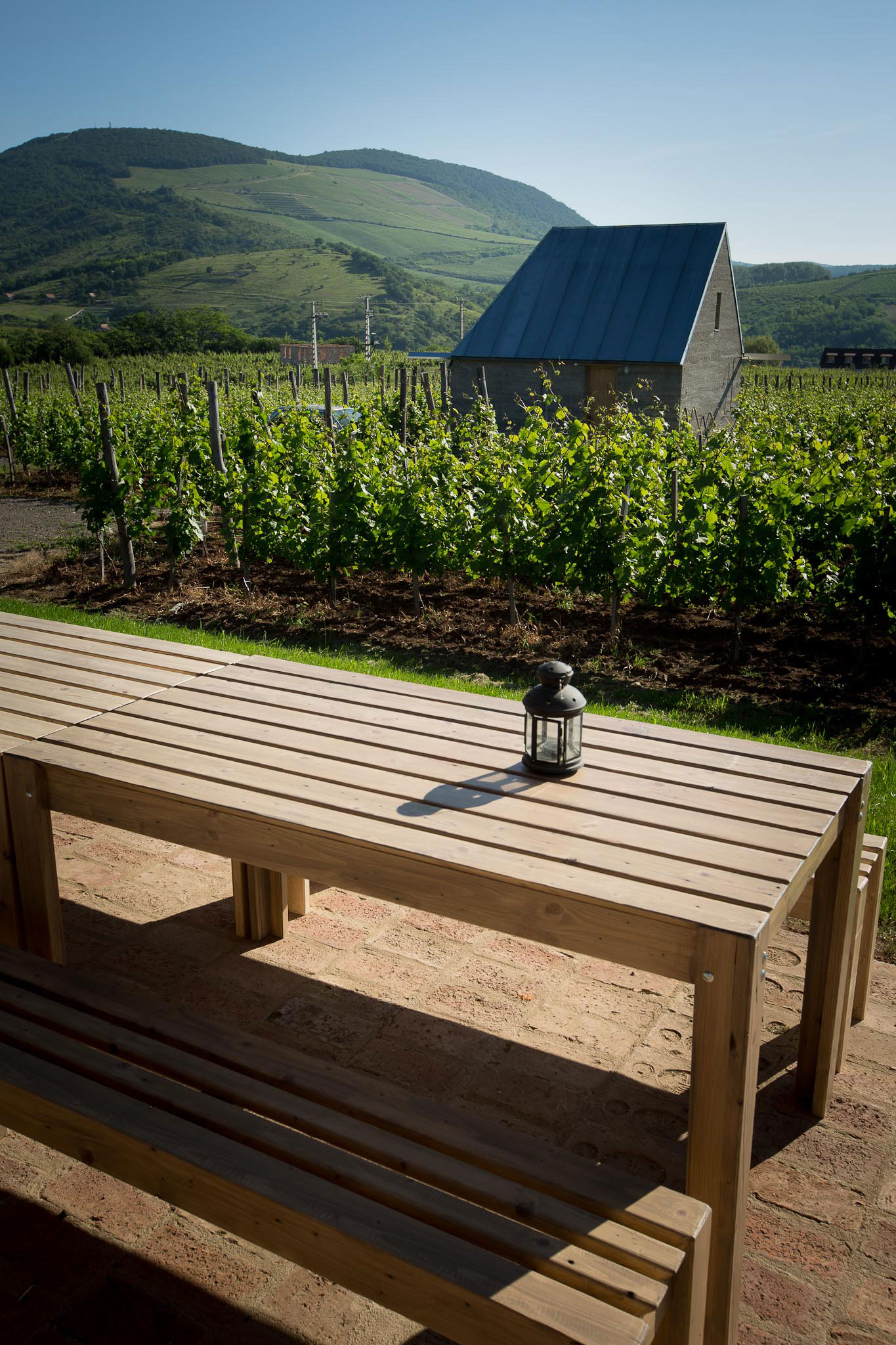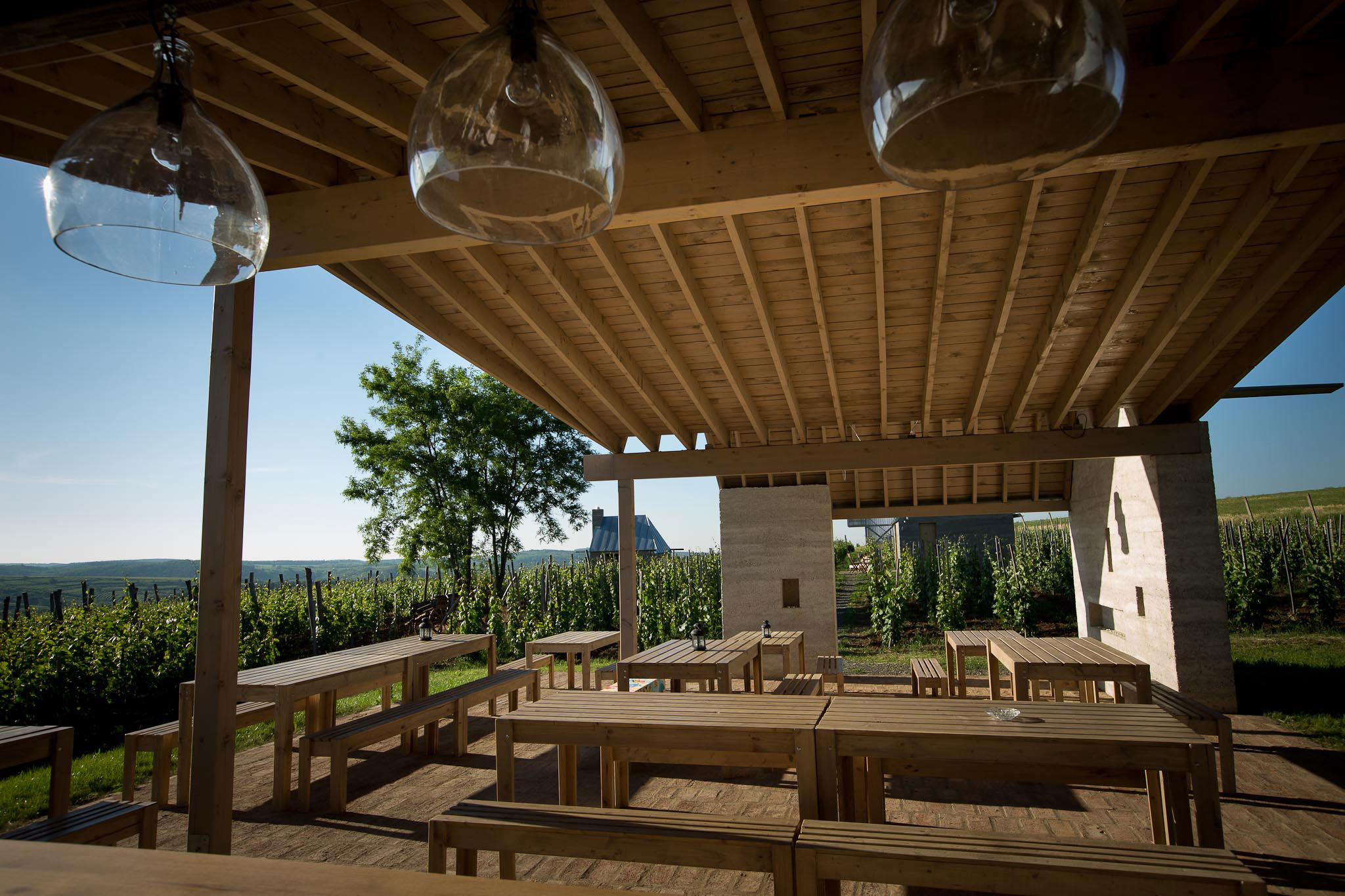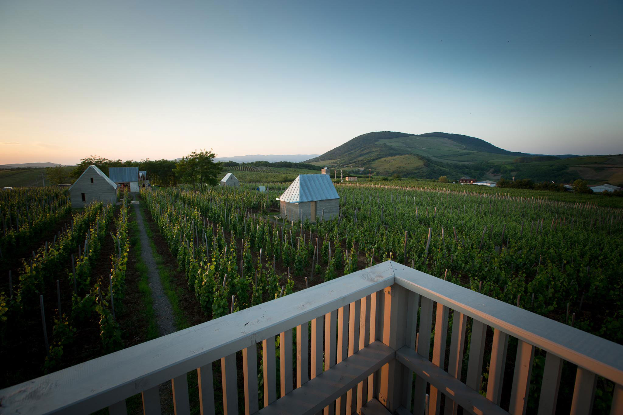 Medzitým sa vyvíjal architektonický návrh. Hostia môžu relaxovať na terase najväčšieho z celkovo troch bungalovov, ktoré sú zariadené v minimalistickom štýle. Viacnásobne ocenená architektúra od budapeštianskeho architektonického štúdia Gereben Marián vo vínnych svahoch je materiálovo založená na zmixovaní cementu s lokálnou horninou vulkanického pôvodu nájdenou architektmi v okolí vinice. Najstaršie pivnice v tejto lokalite sú priamo vytesané do tohto kameňa.