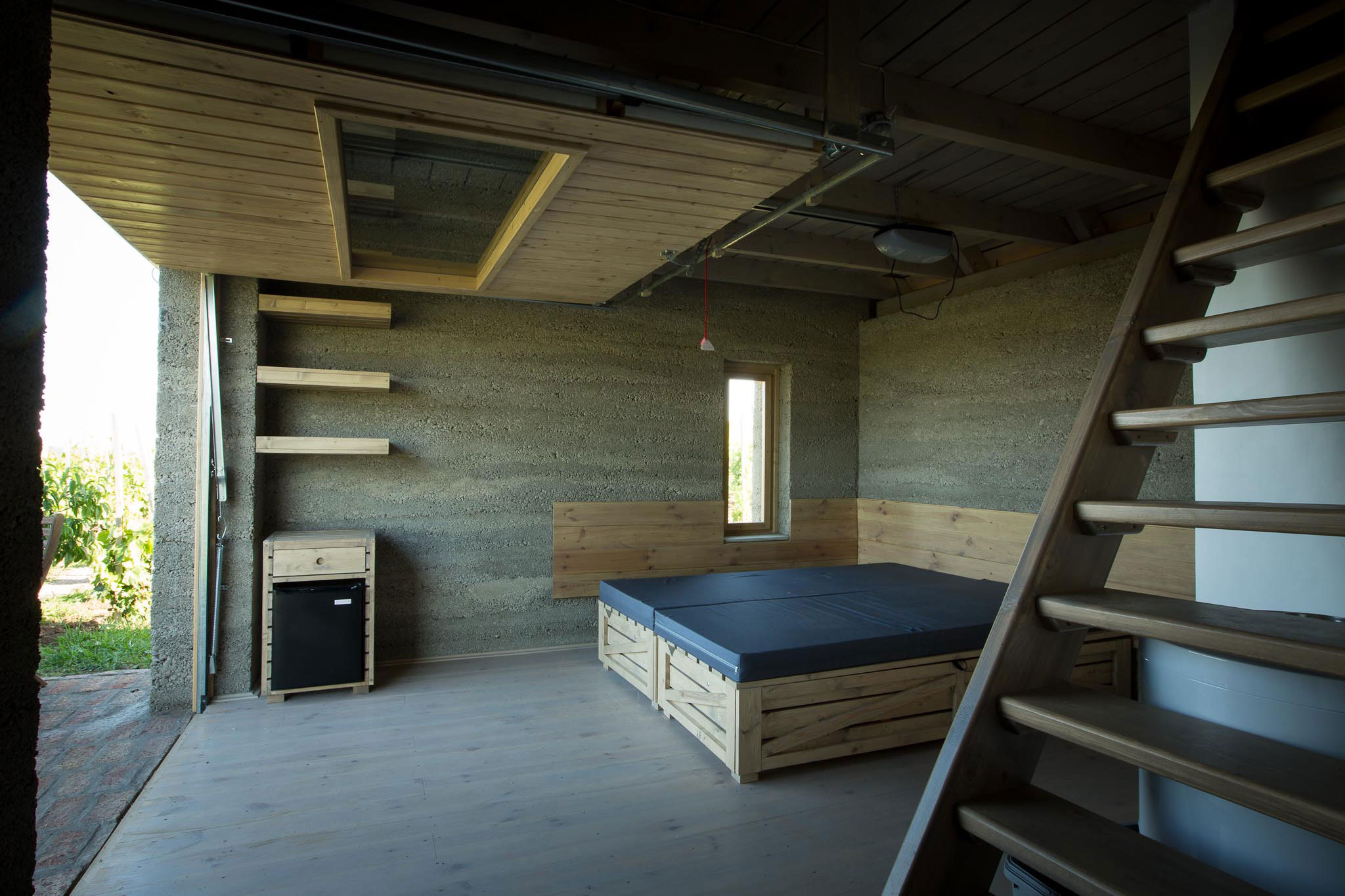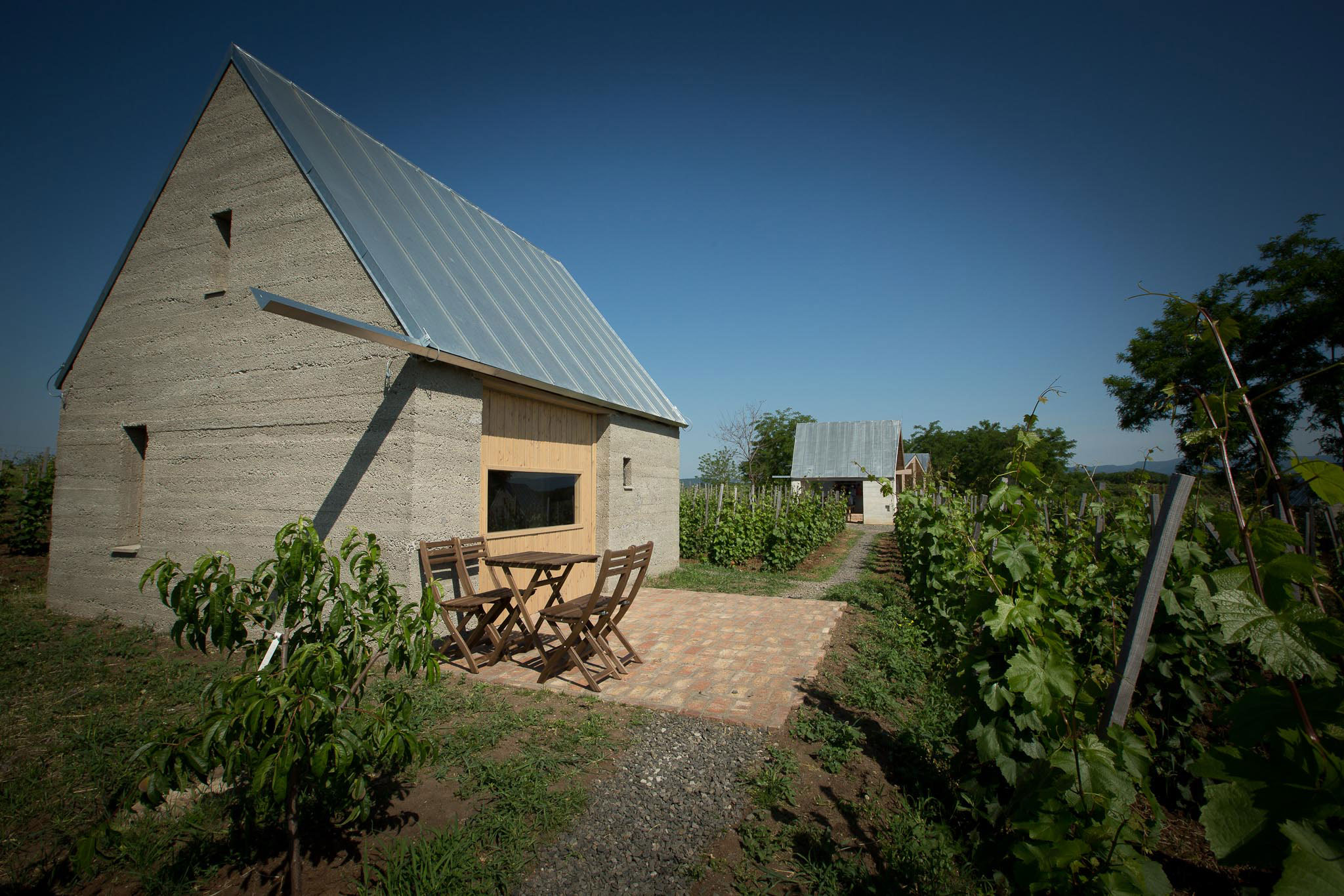 Bol to v podstate recyklovaný odpad zadarmo, lacné riešenie, ktoré reflektuje celkový koncept vinice. Vytvorili tak dojem drsných strohých povrchov stien bungalovov. Dva sú vybavené exteriérovou sprchou, jeden má vlastnú kúpeľňu. Svojimi charakteristickými proporciami, materiálovým využitím a sedlovou strechou pripomínajú archaické budovy tunajšej vinárskej oblasti.