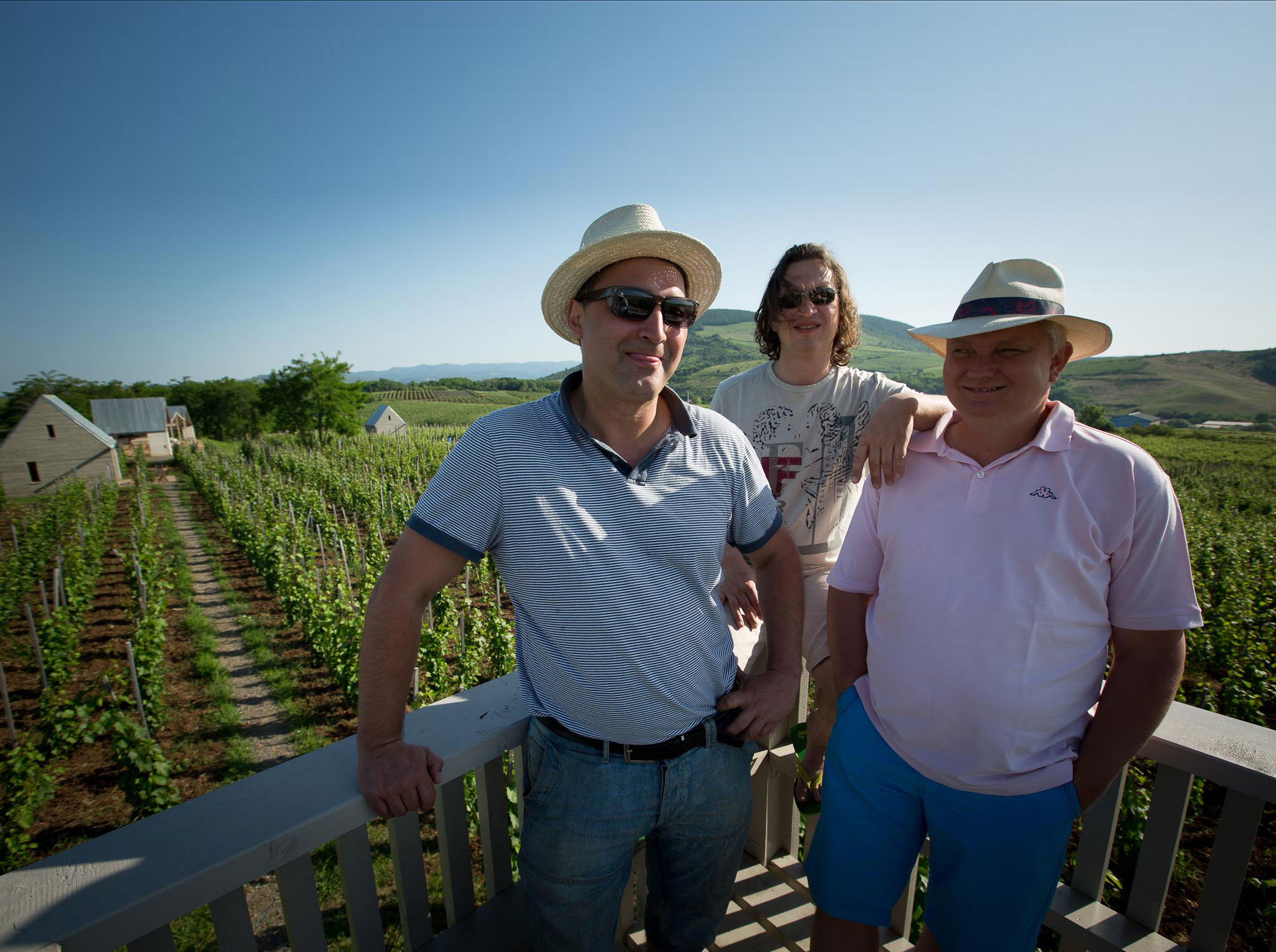 Zľava doprava majitelia vinice Peter Meszaros, Imre Csernus, Ferenc Csutorás.