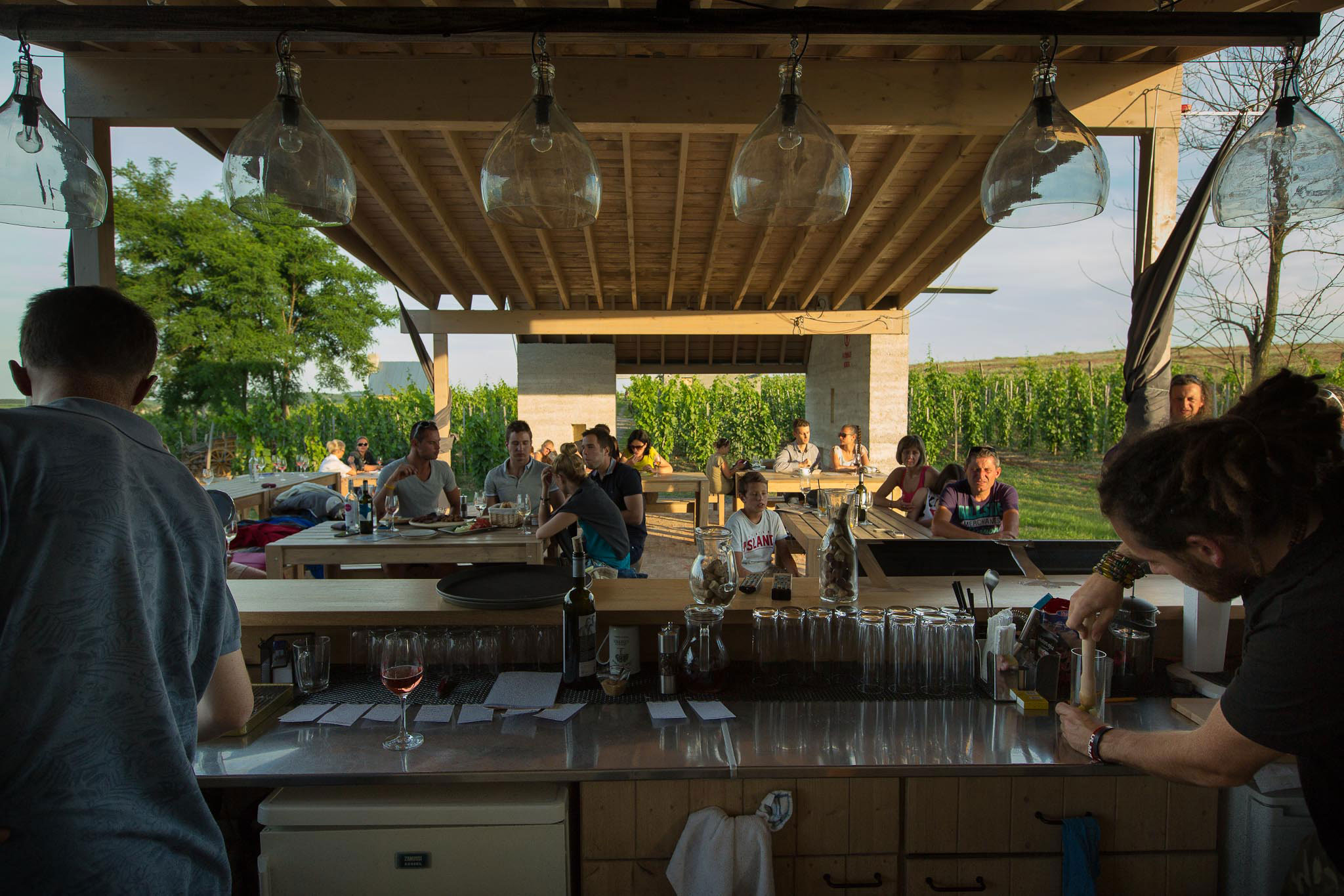 Hlavná budova baru s vínnou terasou a kapacitou 60 hostí ponúka studené i teplé jedlá, okrem vlastných vín Kardinálovej vinice tu možno ochutnať aj vína z Egeru a Tokaja a kávu Depresso. Vybavená je tiež sociálnymi zariadeniami pre kempujúcich v rovnakej kvalite. Harmoniková štruktúra strechy terasy poskytuje ideálne miesto na odpočinok s možnosťou vychutnať si krásny výhľad s pohárom vína. Táto časť areálu sa využíva aj ako romantický spot pri menších svadbách a eventoch.