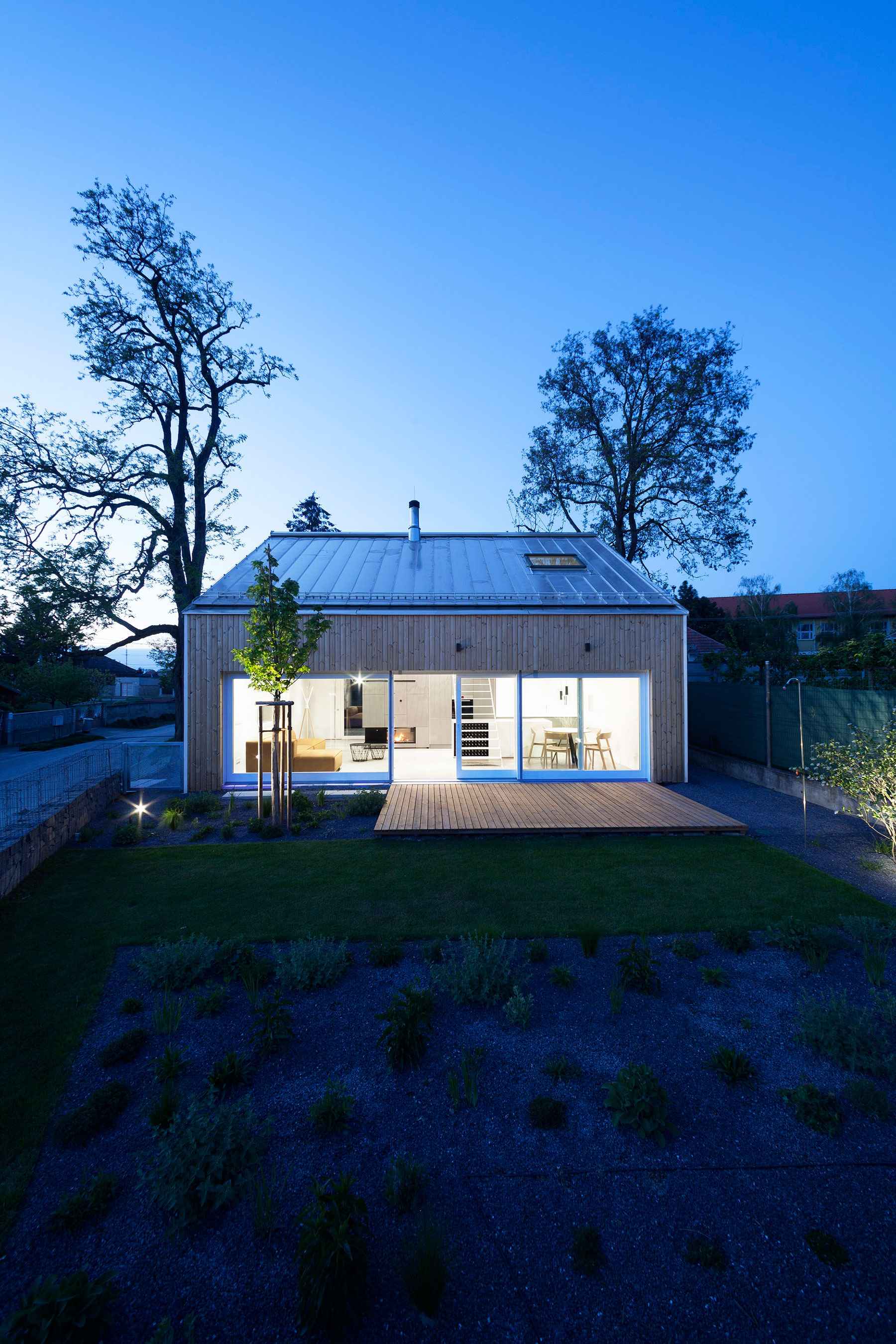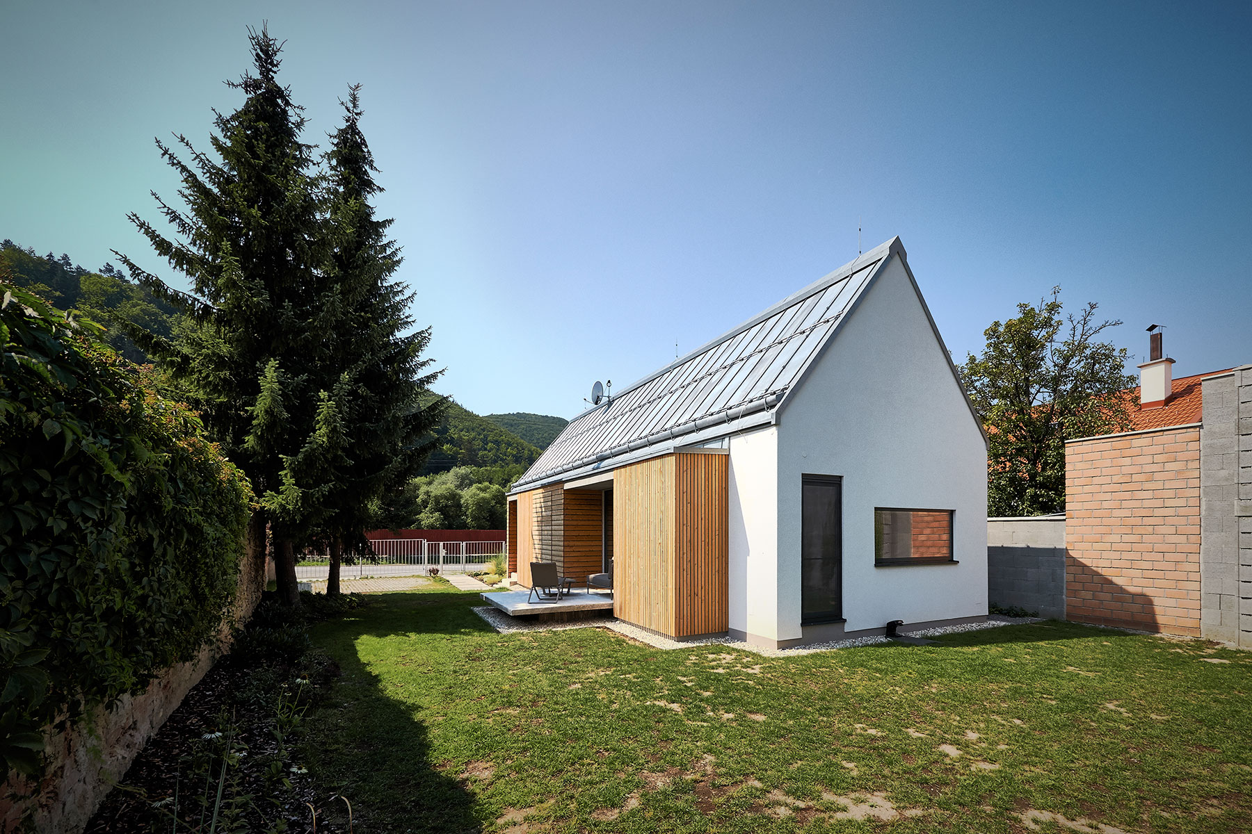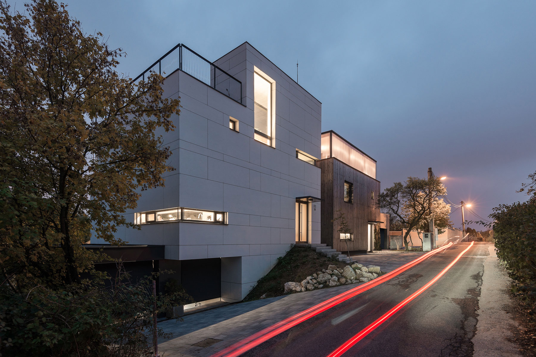 „Dva podobné domy ‐ dva rôzne prístupy. Predstavujeme prvý z dvojice susediacich rodinných domov, ktoré vznikli koordinovane v našom ateliéri. Na začiatku sme našli 660 metrový pozemok susediaci s lesom a krásnym výhľadom na Bratislavu. Zmestiť sem dva rodinné domy aj so záhradami bola pre nás celkom slušná výzva. Pozemok je ešte k tomu rovinatý, s miernym prevýšením. Pozemok sme rozdelili na dve rovnaké časti, každý dom má teda 330 metrový pozemok. Obidva domy majú podobný základný pôdorys a dispozičnú logiku, no predsa sú úplne iné. Majitelia mali celkom iný zoznam priorít, čo sa odrazilo na finálnej architektúre každého domu.“