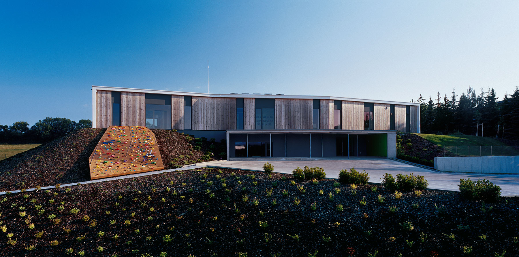 „Individuálne zadanie s prioritou času predurčilo voľbu realizácie zámeru ako prestavbu/dostavbu jestvujúceho objektu napriek tomu, že možnosti lokality vylúčili súvisiacu typológiu. Objekt pohltil rozostavaný rurálny rodinný dom väčšej mierky s radikálnosťou potrebnou k zmene funkcie a zotretiu zažitých schém a vzťahov. Rodinný dom bol zbavený šikmej strechy a dva dvojpodlažné segmenty jeho pôdorysu doplnil tretí. V objekte vznikol rekonfigurovaním terénu vstupný suterén s kompletným zázemím a prízemie denných aktivít napojené na záhradu. Prehľadná dispozícia vizuálne definuje zdieľané priestory, herne obsadené podľa vekových skupín, zázemie personálu a koridory. Exteriér vsádza na príjemnú proporciu a tvaroslovnú (tvarovú) istotu v súčasnom ponímaní.“