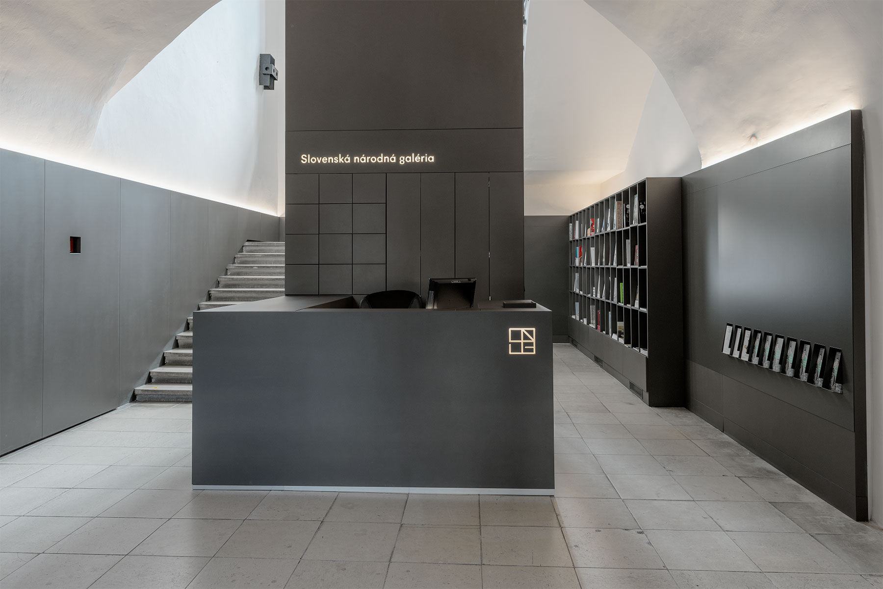Vložený objekt knižnice delí priestor na dva samostatné celky s rôznymi kvalitami a funkciami. V zaklenutom vstupnom priestore dominuje reprezentatívny symetrický informačný pult. V členitej veži schodiska je umiestnená expozícia kníh a katalógov s pravidelne rastrovanými policami a mobilnými kontajnermi.“
