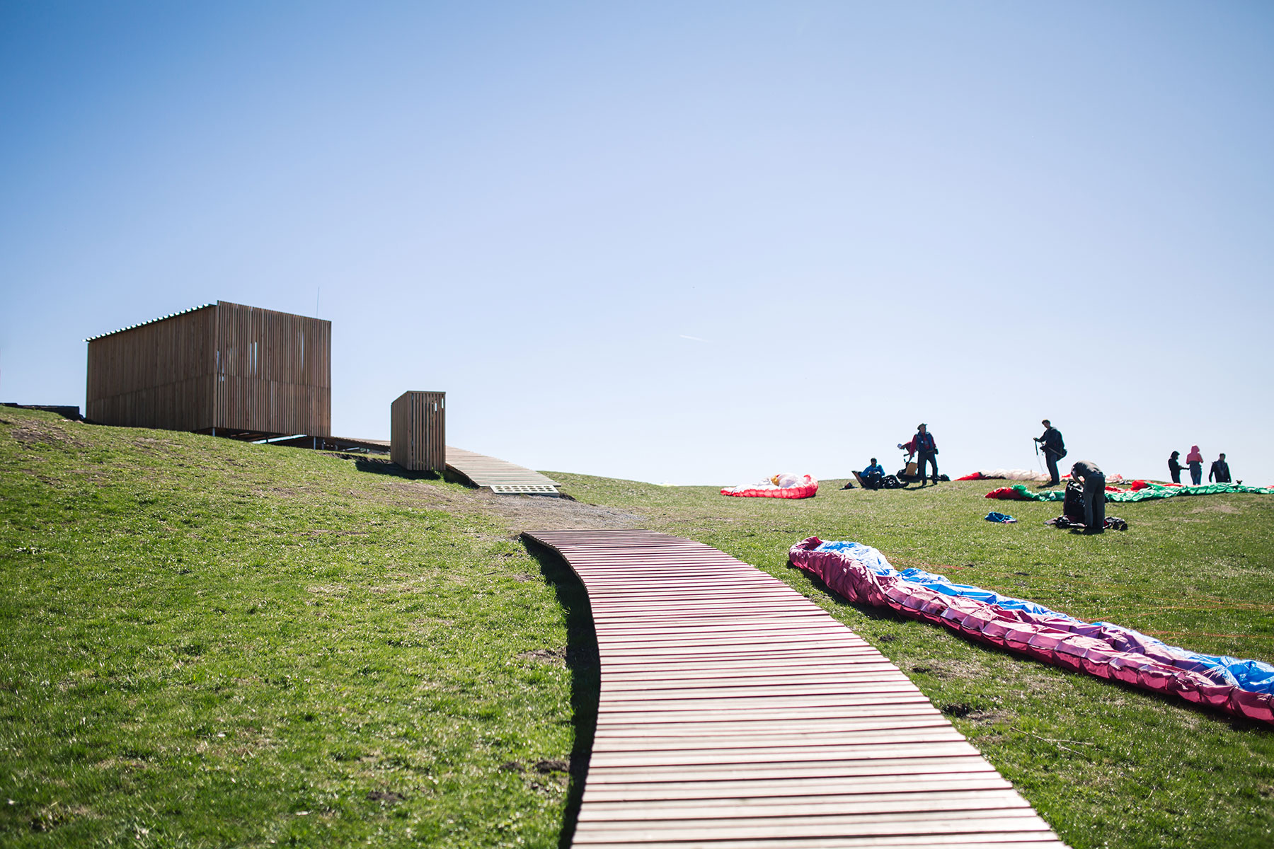 Navrhli sme subtílnu lávku, ktorá má ambíciu organizovať pohyb turistov kontrolovane, bokom od letcov a uľahčovať prístup na vrchol kopca návštevníkom s obmedzenou schopnosťou pohybu. Lávka levituje nad terénom, je s ním v kontakte iba prostredníctvom zemných skrutiek. Kúsok pred vrcholom je prerušená, pre potrebu umožniť prejazd ťažobným vozidlám. Na konci čaká nový prístrešok a lavička pri symbolickom cintoríne letcov s výhľadom na Malú Fatru.“