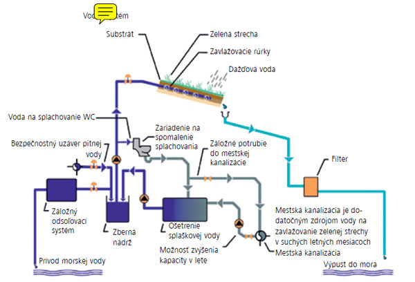Hospodárenie s teplom majú na starosti aj tepelné čerpadlá na morskú vodu. Využívajú jej stálu teplotu, v zime na vykurovanie a v lete na chladenie interiéru. Recykláciou použitej pitnej vody dosiahlo centrum úsporu v spotrebe pitnej vody o 60 až 70 %. V spolupráci s morskými biológmi sa v časti, kde centrum zasahuje do mora, vybudoval morský útes, ktorý sa stal súčasťou prirodzeného morského pobrežia a už sa v ňom zabývali rôzne morské rastliny, riasy a živočíchy.