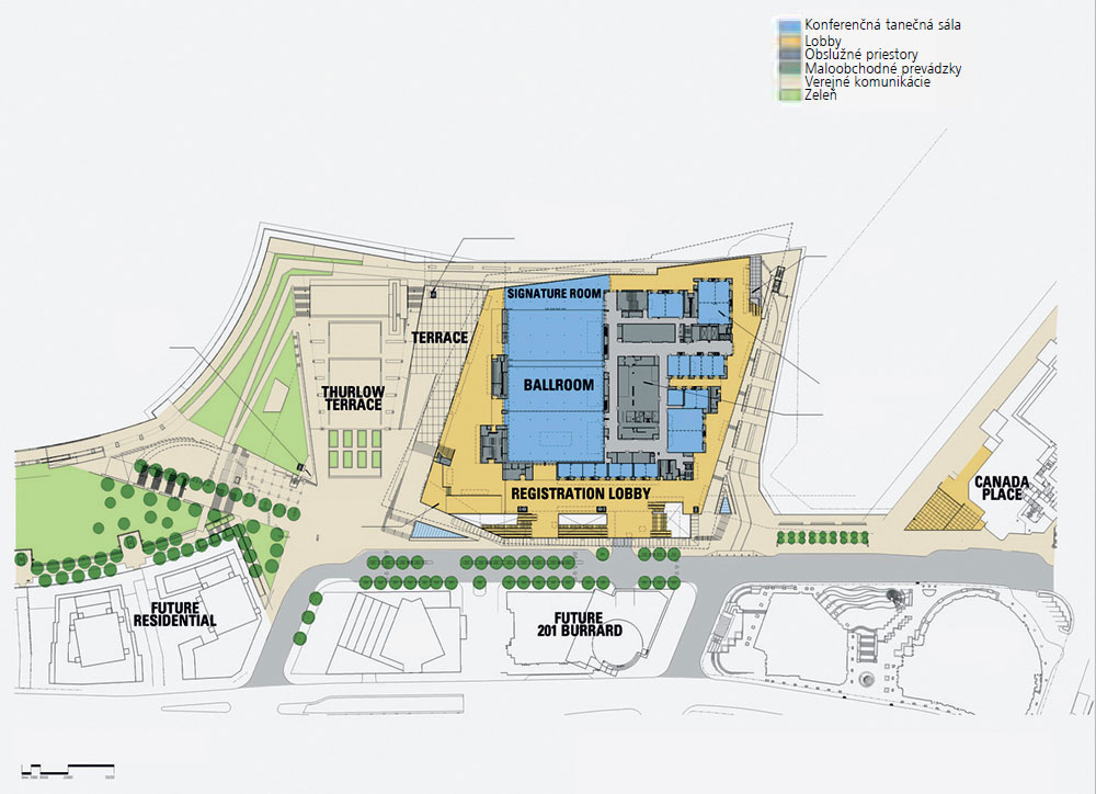 | Funkčná náplň Vancouver Convention Centre West: výstavná sieň: 20 717 m2 zasadacie priestory: 5 574 m2 tanečná sála: 5 109 m2 maloobchodné prevádzky: 8 825 m2 pešie a cyklistické trasy, verejné priestranstvá a námestia: 37 161 m2 počet parkovacích miest: 450 |