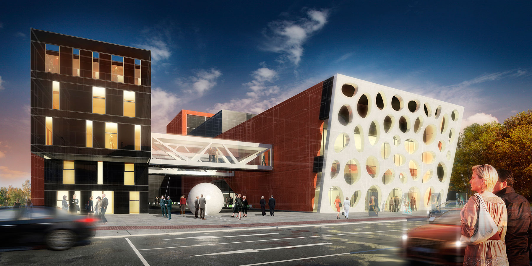 Betón sa stáva na tejto stavbe maximálne variabilným materiálom, či už tvarovo, alebo farebnými kombináciami. Biela fasáda z liateho betónu sa vyníma pred tmavou fasádou z čierneho betónu a túto farebnú škálu dopĺňajú obkladové dosky bočných stien z liateho sýtočerveného pohľadového betónu. Rôznorodým rozmiestnením eliptických otvorov sa fasáda mení počas celého dňa. Je naklonená o 11° a jej horná hrana presahuje chodník o 2,65 m. Divákov má do divadla lákať troma vstupnými otvormi zakomponovanými do fasády. Fasádu s organickým dekorom časom doplní plastika pripomínajúca okruhliak, ktorá bude umiestnená v ťažisku vnútorného átria.