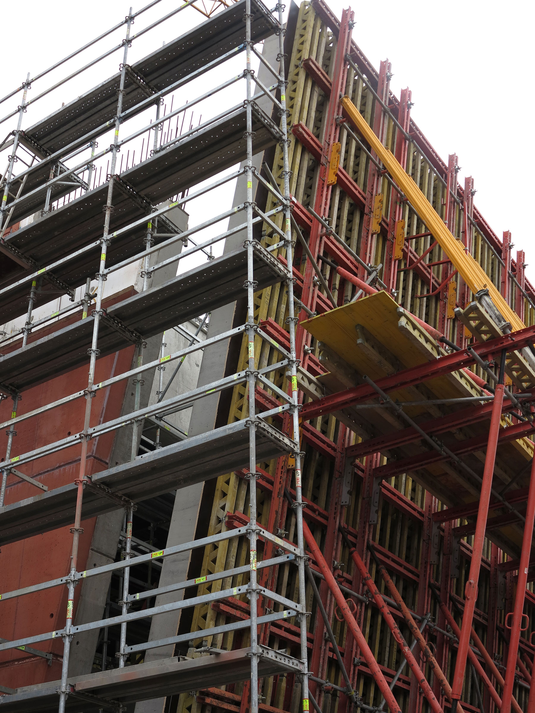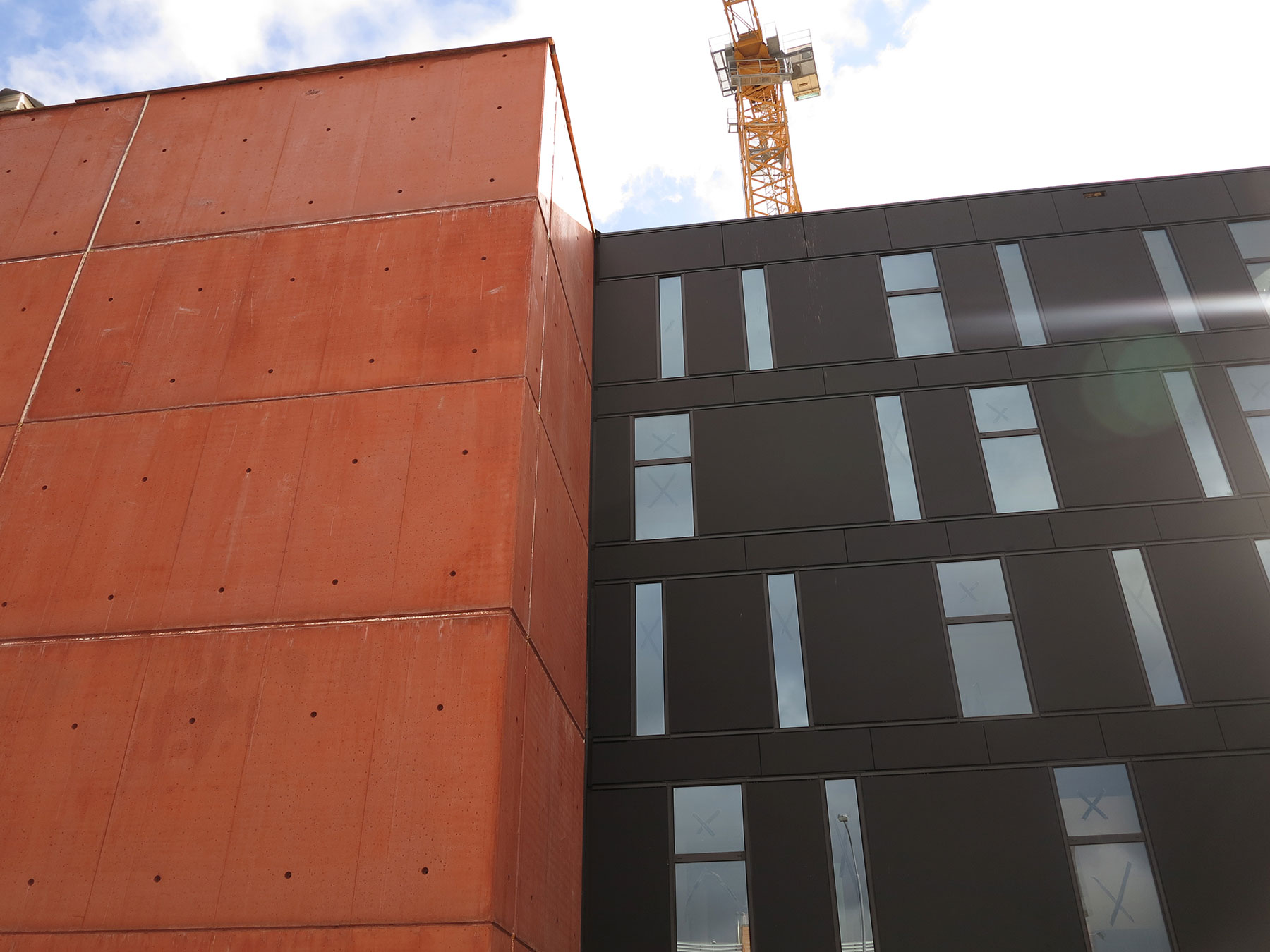 Červenú fasádu bočných stien z pohľadového betónu dopĺňajú zasklené plochy z matného čierneho leptaného skla a titánzinkové plochy. Červený betón obsahuje farebné anorganické pigmenty na báze červeného oxidu železa. Tieto pigmenty zaručujú dlhodobú stálosť farebného odtieňa a boli dovezené špeciálne až z USA. Obklad sa testoval aj z hľadiska odolnosti proti poveternostným podmienkam, UV žiareniu a ďalším negatívnym faktorom. Uchytenie betónových dosiek zaisťujú fasádne a klincové kotvy proti satiu a zdvíhaniu rohov jednotlivých dielov.