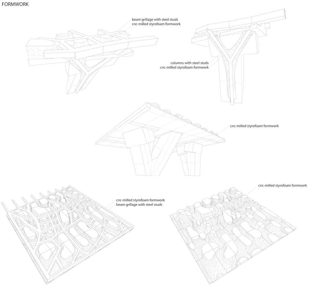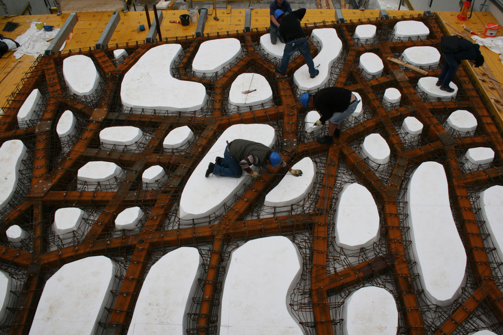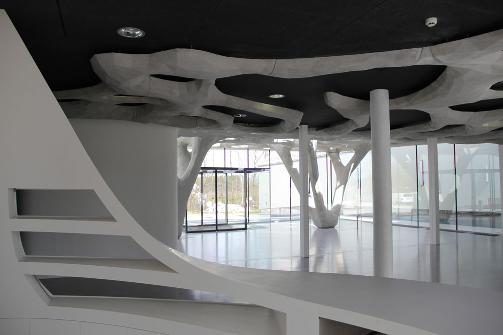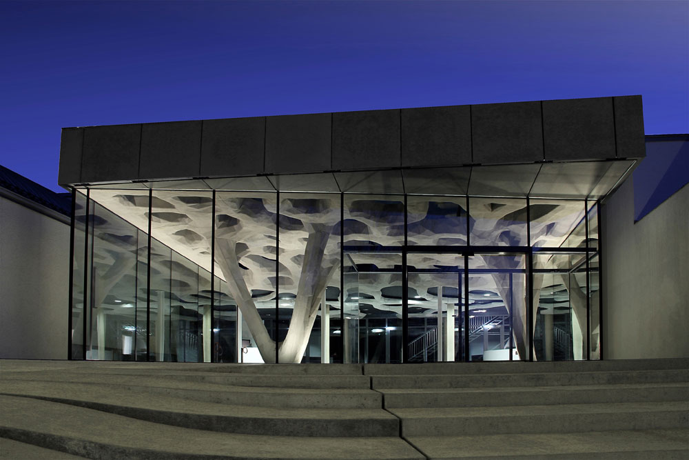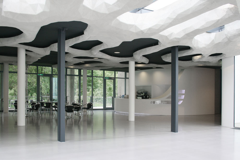 Výslednú zložitú štruktúru sa architekti rozhodli vytvoriť z pohľadového betónu. Najväčšou výzvou v rámci celého projektu tak bola konštrukcia debnenia, ktoré sa testovalo a optimalizovalo na modeloch v mierke jedna k jednej. V rámci týchto testov sa skúšali rôzne verzie drobnej triangulácie betónového povrchu i rôzne spôsoby frézovania. Vedľa vchodu stoja oceľové piliere skryté v betónových škrupinách, ktoré rastú zo zeme ako stromy a následne sa vetvia a nadväzujú na stropnú konštrukciu. Ich betónovú škrupinku odliali na mieste do foriem z extrudovanej peny. Z tejto peny vzniklo aj zložito tvarované debnenie na stropnú konštrukciu, ktorá obsahuje oceľový rošt vyrobený na mieru.