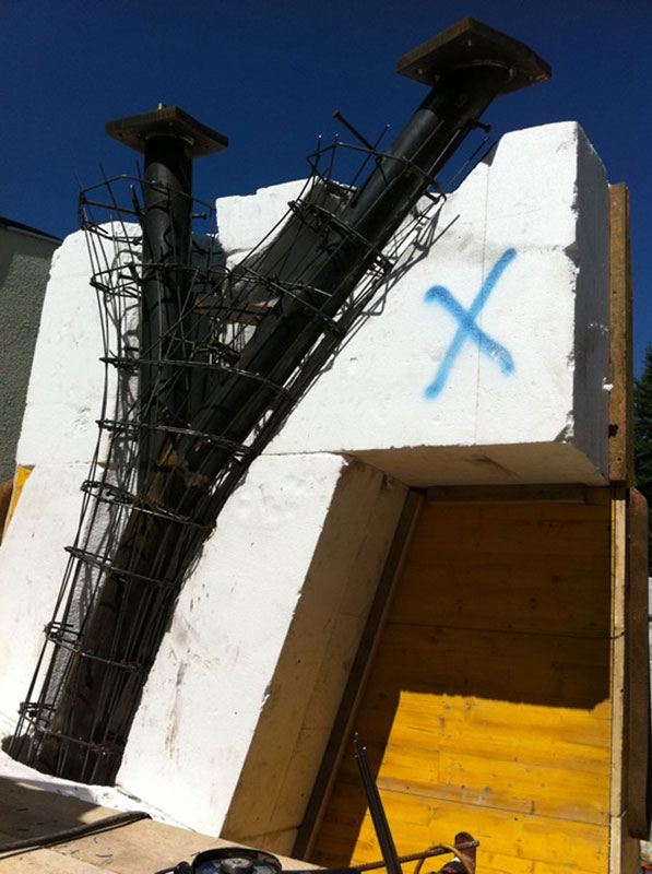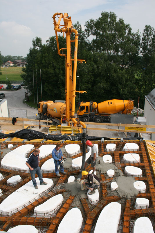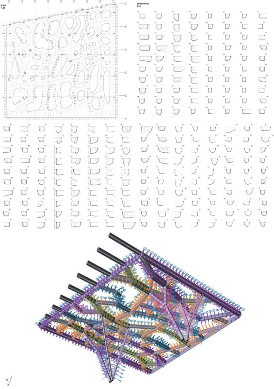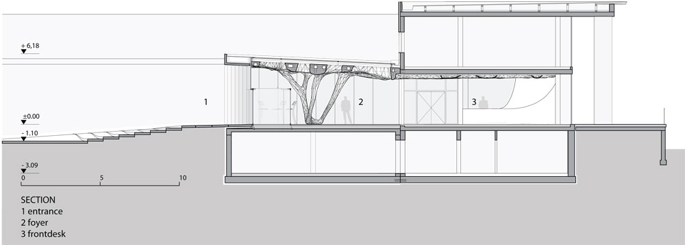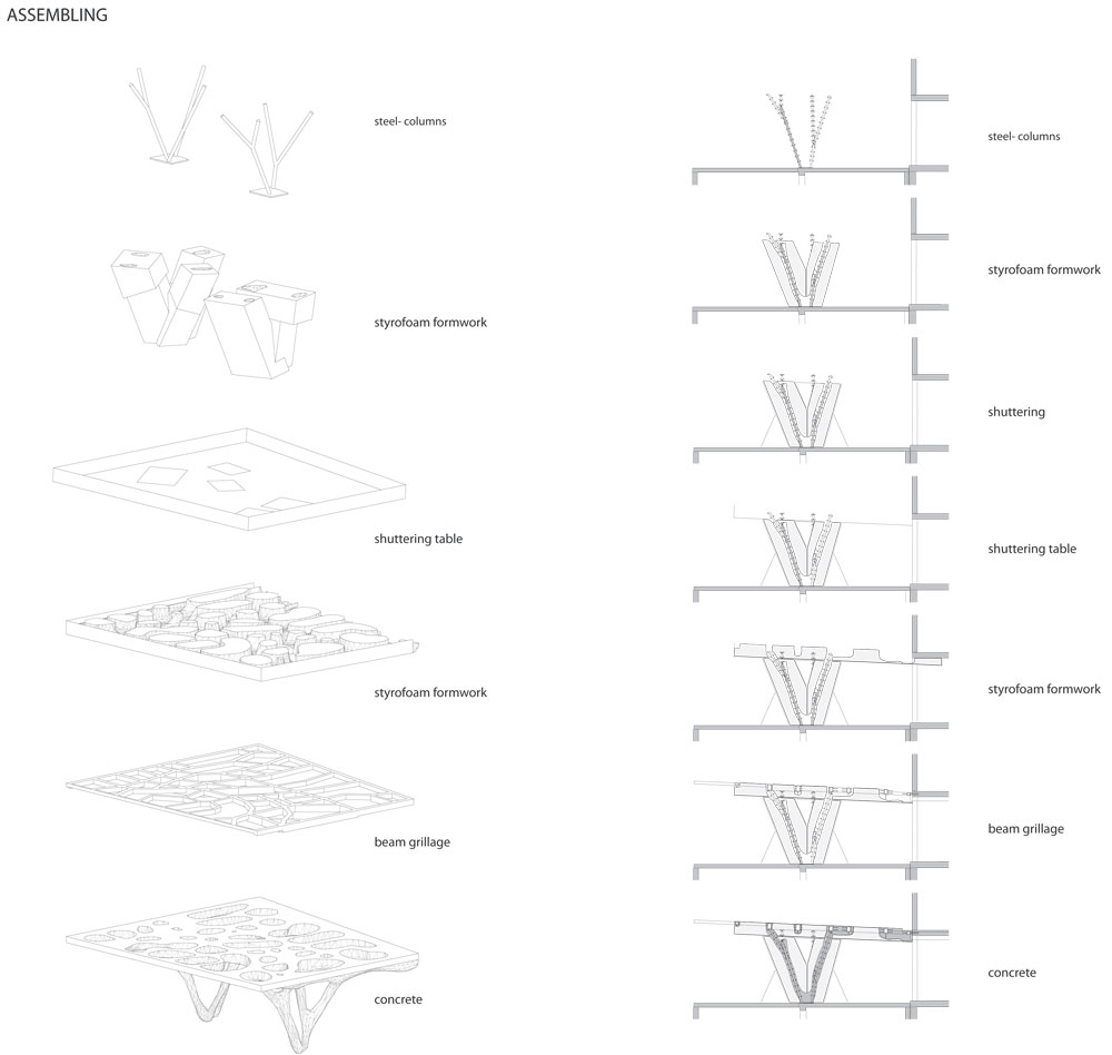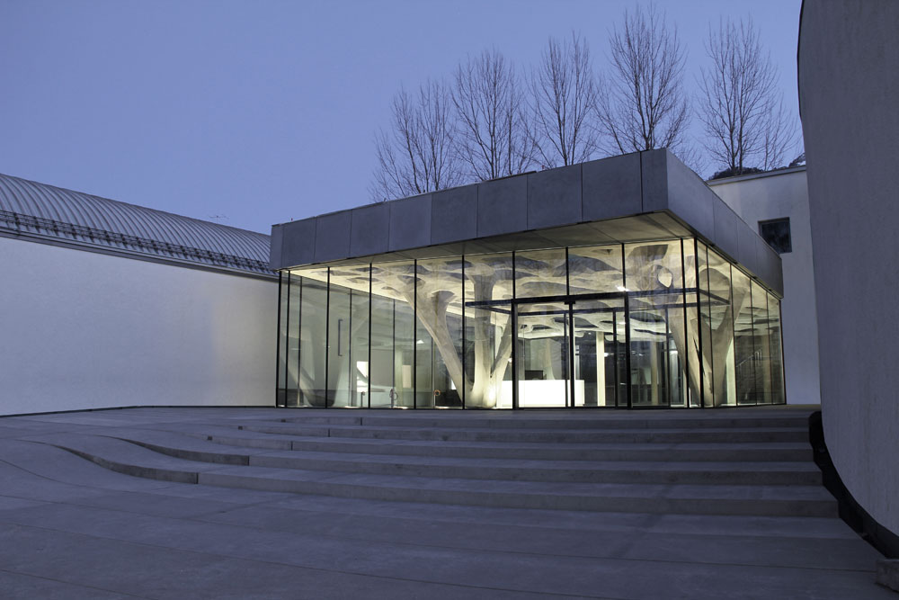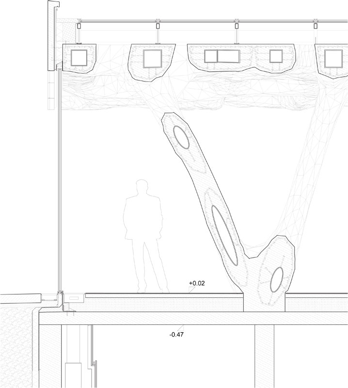 Výslednú zložitú štruktúru sa architekti rozhodli vytvoriť z pohľadového betónu. Najväčšou výzvou v rámci celého projektu tak bola konštrukcia debnenia, ktoré sa testovalo a optimalizovalo na modeloch v mierke jedna k jednej. V rámci týchto testov sa skúšali rôzne verzie drobnej triangulácie betónového povrchu i rôzne spôsoby frézovania. Vedľa vchodu stoja oceľové piliere skryté v betónových škrupinách, ktoré rastú zo zeme ako stromy a následne sa vetvia a nadväzujú na stropnú konštrukciu. Ich betónovú škrupinku odliali na mieste do foriem z extrudovanej peny. Z tejto peny vzniklo aj zložito tvarované debnenie na stropnú konštrukciu, ktorá obsahuje oceľový rošt vyrobený na mieru.
