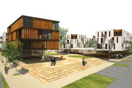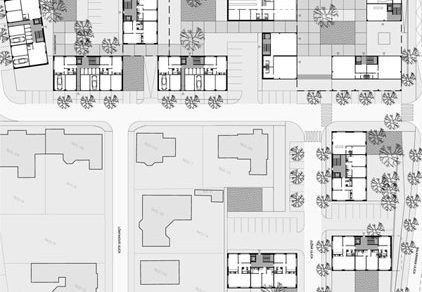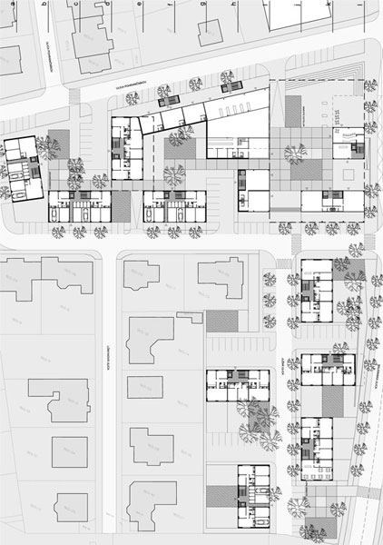 Architektonická koncepcia chce formou modernej architektúry artikulovať komornú mierku nízkopodlažných typov objektov. Základnou jednotkou je bytový, resp. polyfunkčný objekt, ktorého rozmery vychádzajú z urbanistického modulu 12 × 12 m. Architektonický výraz pracuje s tradičným okenným otvorom v kontexte s historickým prostredím. Materiály: omietka, drevo, sklo, prírodný kameň. Architektonickou dominantou je administratívny objekt (radnica) v severozápadnej časti námestia, ktorý otvoreným parterom vytvára vstupnú bránu do územia.