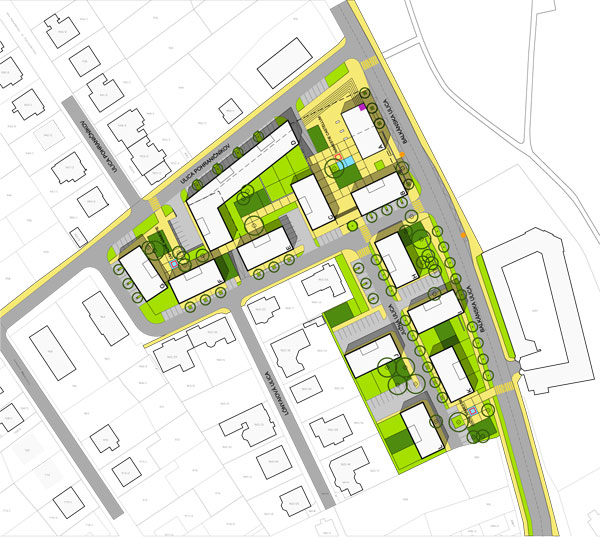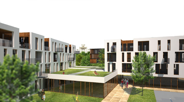 Hlavným cieľom riešenia bolo urbanisticky a architektonicky dotvoriť predmetnú lokalitu s ambíciou vytvoriť nové moderné subcentrum mestskej časti v atraktívnom prostredí na hlavnej kompozičnej osi Rusoviec v tesnej väzbe na neogotický kaštieľ s priľahlým parkom.