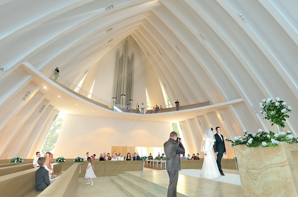 Objekt sa nachádza v strede budúceho ostrova. Jeho ťažisko je v priesečníku kompozičných osí definovaných územným plánom mesta. Pôdorysná stopa stavby je riešená v tvare ryby, ktorá symbolizuje úspech, šťastie, lásku a priateľstvo. Plášť stavby tvoria plynulé krivky evokujúce napnuté plachty plachetnice, do ktorých sa opiera vietor. „Chrám ako koráb je nabitý pozitívnou energiou, brázdi morom a hľadá začiatok niečoho nového – vstup do manželstva,“ upozorňuje Zuzana Madolová.