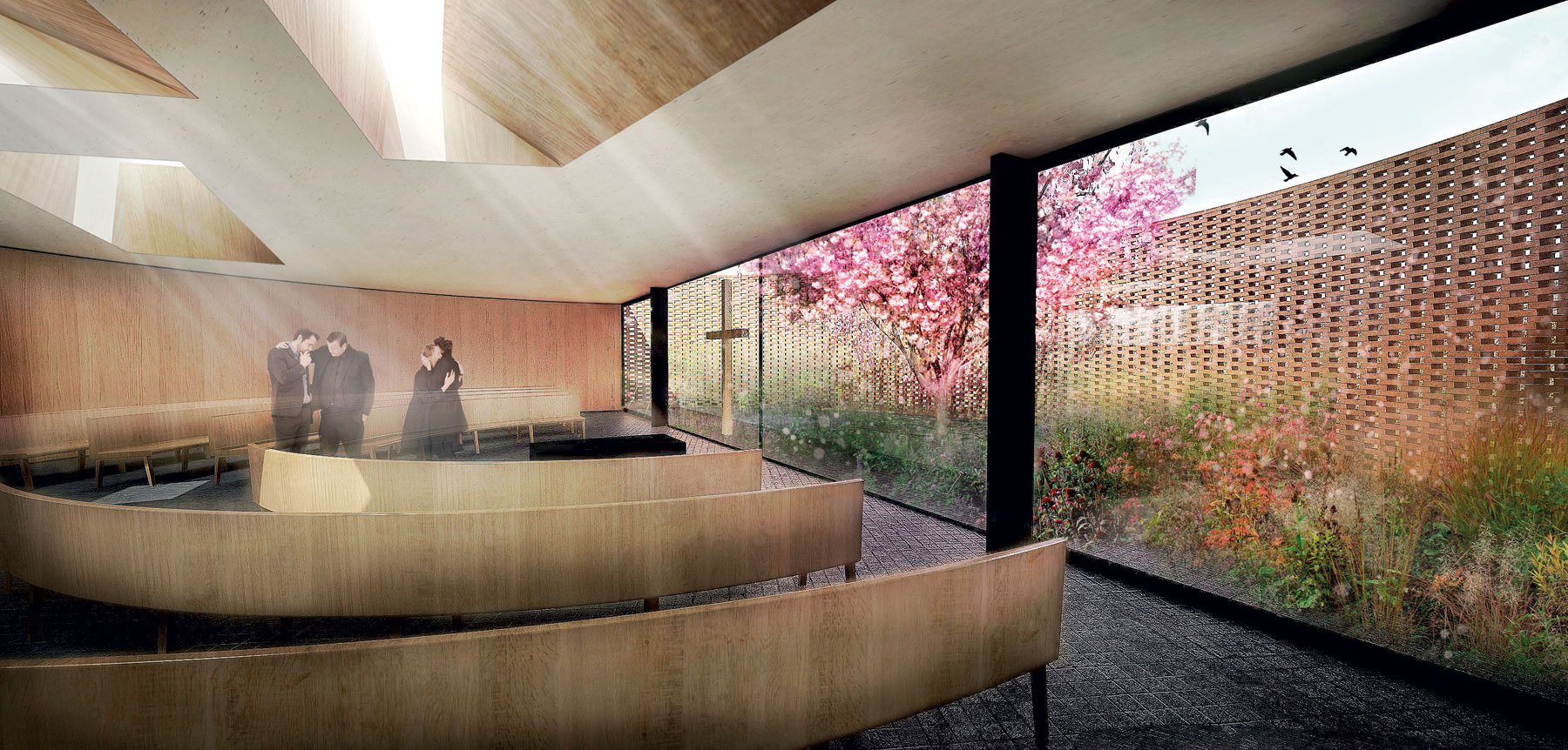 Dom smútku sa v projekte nachádza na miestnom cintoríne, ktorý je priamo v obci, a z dvoch strán ho lemujú rodinné domy. Rozvojové územie hrobov bolo umiestnené na druhej strane stavby. Architekti sa rozhodli pre jednoduchú stavbu, ktorá by nekonkurovala neďalekej malej historickej kaplnke a zároveň by nenarúšala susedné pozemky rodinných domov.