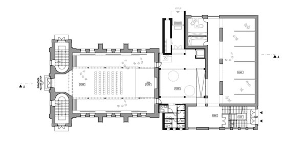 Pôvodný projekt rekonštrukcie synagógy neuvažoval o využití školy. Teraz, po jej majetkovoprávnom vysporiadaní, je možné z dvoch objektov vytvoriť kultúrno-spoločenské centrum prepojené spoločným nádvorím. Pôvodne mala synagóga hlavný vstup zo strany hradu, ale v budúcnosti sa bude používať iba výnimočne. Bočné vstupy do synagógy vedú na empory, ktoré boli podľa židovskej tradície určené ženám. Keďže v novom koncepte sa z dvoch budov vytvorí jeden komplex, je vhodnejšie situovať nový vstup do nádvoria medzi synagógu a školu zo severnej strany. Nádvorie bude prekryté a v budúcnosti sa bude využívať aj ako vstupná hala so servisnými priestormi. Návštevnícky výťah bude vertikálnou komunikačnou osou obidvoch objektov. Pred vstupom budú aj odstavné plochy pre automobily návštevníkov.