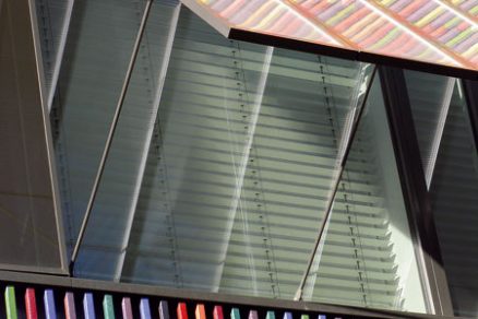 Usporiadaním tyčí do troch skupín z rozlične zmiešaných farieb sa docielili tri hlavné odtiene fasády – svetlý, stredný a tmavý, ktoré opticky rozdeľujú pomerne mohutný objem do troch vzájomne sa prelínajúcich a chromaticky odlíšených hmôt. Samotná budova však z konštrukčného hľadiska predstavuje dlhý dvojpodlažný objekt pravouhlého tvaru, ktorý sa na križovatke ulíc dvíha nahor vo forme veže s výškou 23 metrov a lichobežníkovým pôdorysom. Precízne kontúry obidvoch častí kopíruje pozdĺžne pásové zasklenie, ktoré kulminuje pri vstupe do budovy. Vďaka tomu sa v interiéri vytvorilo bohato presvetlené foyer s pokladňou, kníhkupectvom a reštauráciou.