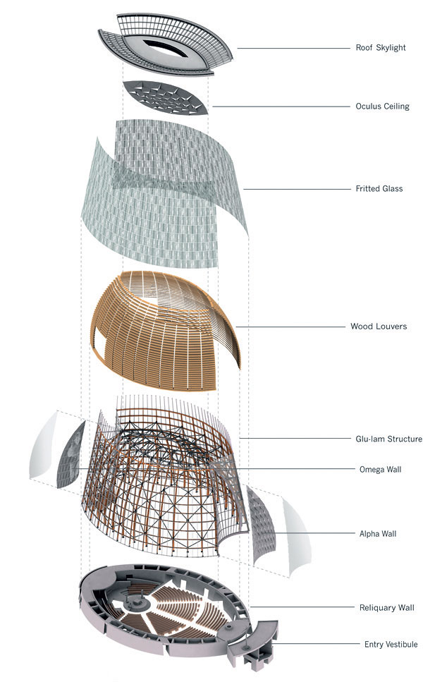 Svetlo je kľúčovým prvkom v Hartmannovom poňatí katedrály. Celý obvodový plášť je z viacerých vrstiev, vonkajšiu tvorí zasklenie s potlačou, osadené na sústave profilovaných lepených nosníkov. Vnútornú formu vytvára 26 lepených samonosných drevených rebier, ktoré nesú sústavu drevených lamiel, vytvárajúc žalúziu prepúšťajúcu do svätyne len nepriame mäkké svetlo. Pohyb slnka a zmena uhla svetla dopadajúceho na drevené lamely dramaticky menia vnútornú atmosféru katedrály. Efekt je možné ovplyvniť unikátnym systémom pohyblivých trojuholníkových lamiel tieniacich alfa okno, zasklený strop aj omega okno.