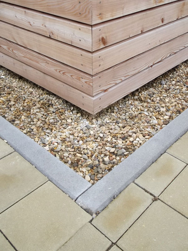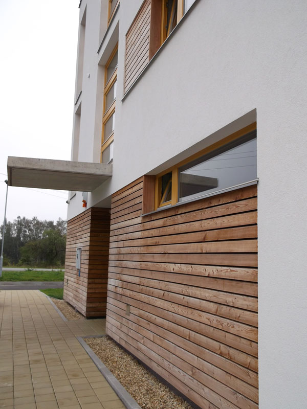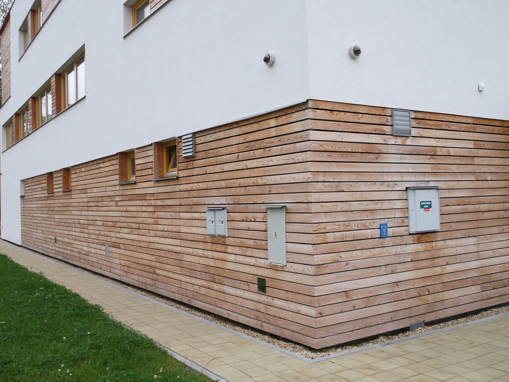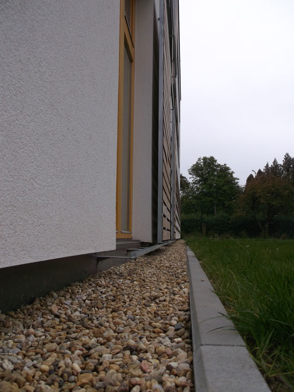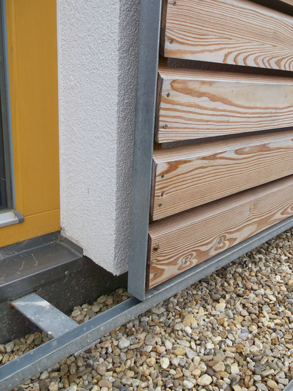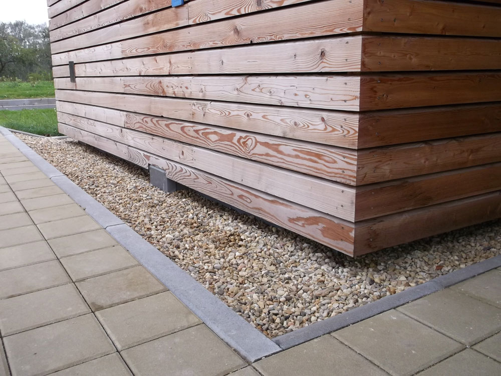 Ochrana drevených obkladov pred pôsobením zrážkovej vody je zabezpečená dostatočným odvetraním a štrkovým zásypom.