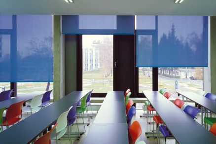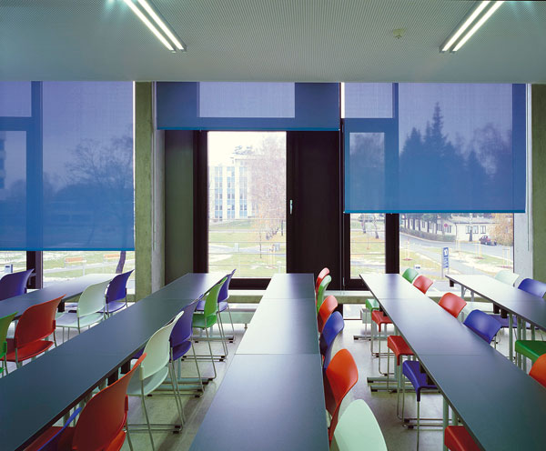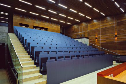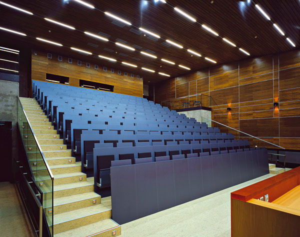 Drevený akustický obklad prednáškovej sály navrhli architekti a špecialisti na akustiku. Tvoria ho tri typy povrchov – rezonančné panely, pevné panely a panely s tvrdými odrazovými povrchmi. Výučbové centrum je vybavené najmodernejšou audiovizuálnou, komunikačnou a výučbovou technikou.