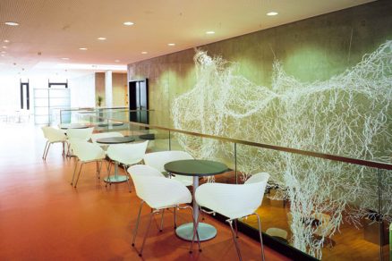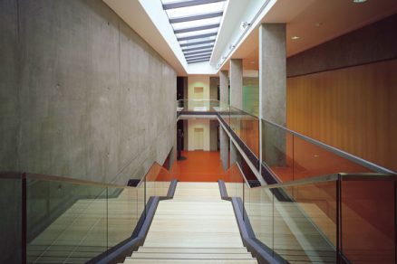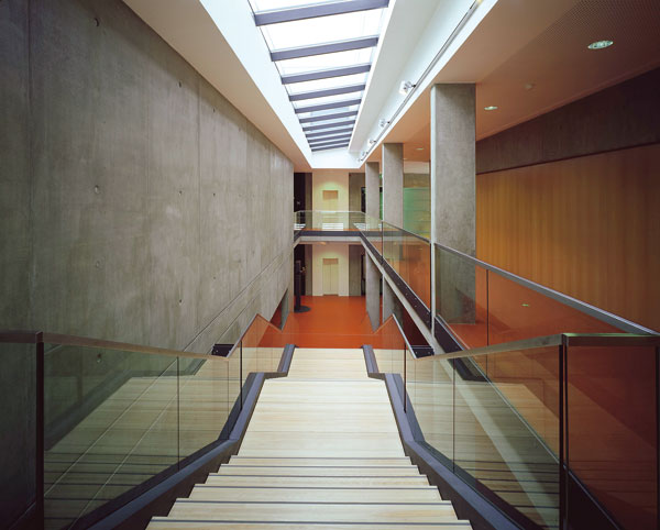Vnútri budovy sú navrhnuté pohľadové betóny vo foyeri (všetky steny a spodné líce šikmej dosky pod sedadlami konferenčnej sály), rám podopierajúci škrupinu pri seminárnej miestnosti smerom do chodby a steny vnútorného schodiska. Na vonkajšej fasáde je pohľadový betón navrhnutý na priečelí smerom k chirurgii a na stene spojovacej chodby smerom k trafostanici.
