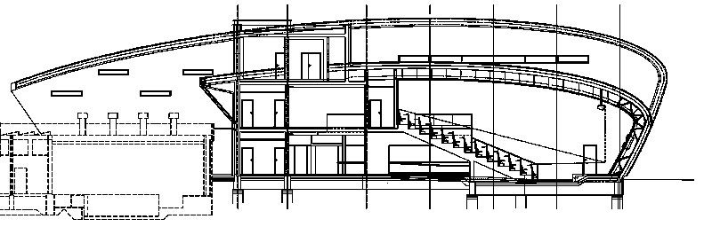 Konštrukčný systém tvorí železobetónová konštrukcia pozostávajúca zo stĺpov a stien a stropných dosiek pôsobiacich v dvoch smeroch. Zastropenie celej budovy a štítovú stenu od interného pavilónu zabezpečuje betónová škrupina v tvare dvoch valcových plôch. Ich riadiaca krivka je z väčšej časti elipsa doplnená prechodnicou. Škrupiny sú zboku podopierané prievlakmi, ktoré sledujú jej zakrivenie, čiastočne potom železobetónovými stenami.