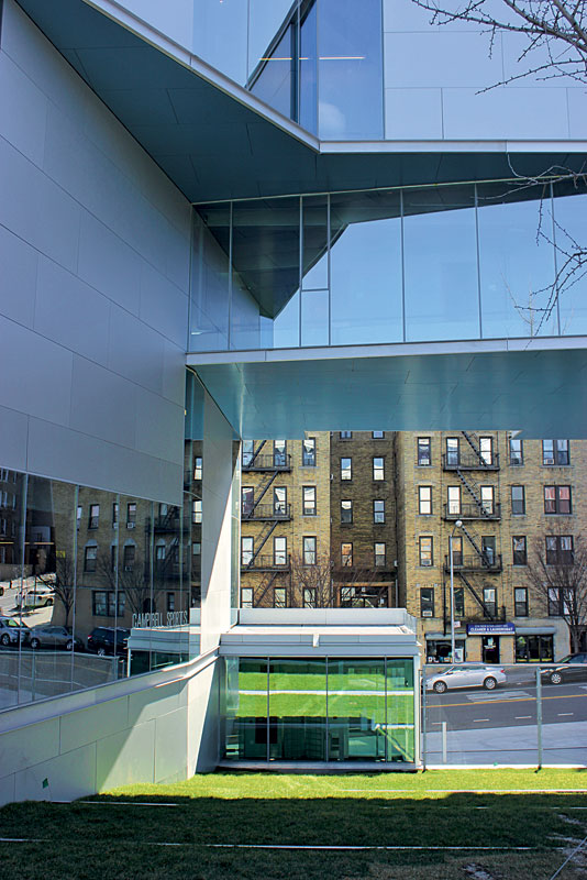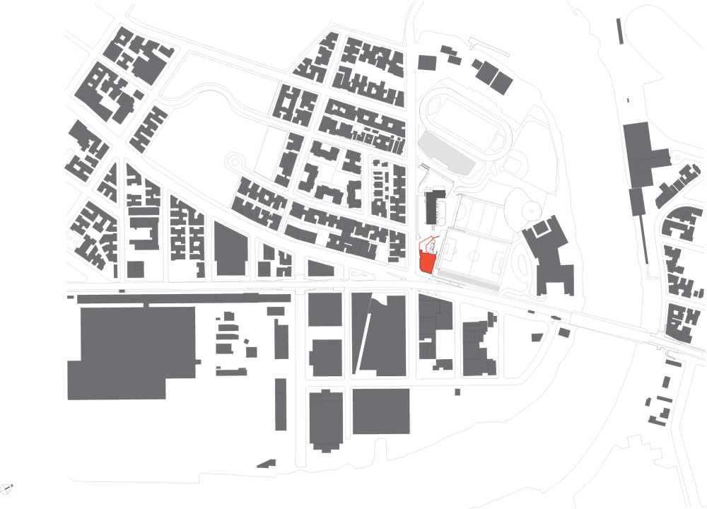 Steven Holl sa však nepozerá na svoj objekt len ako na solitér. Vždy ho vníma v rámci urbanistickej štruktúry, navyše, v prípade Campbell Sports Center je táto situácia dosť sťažená. Objekt je na nároží dopravných tepien New Yorku, neďaleko je stanica metra a veľká prekládka tovaru. „Chcel som vytvoriť bránu do športového areálu, ale aj originálny signálny bod, ktorý by zreteľne artikuloval svoju funkciu,“ hovorí Holl. Terasy a vonkajšie schody sú naozaj tými líniami v priestore, ktoré kreslia ihrisko na fasáde budovy a z vyšších poschodí ponúkajú rozmanité výhľady na ihrisko zvané Manhattan.