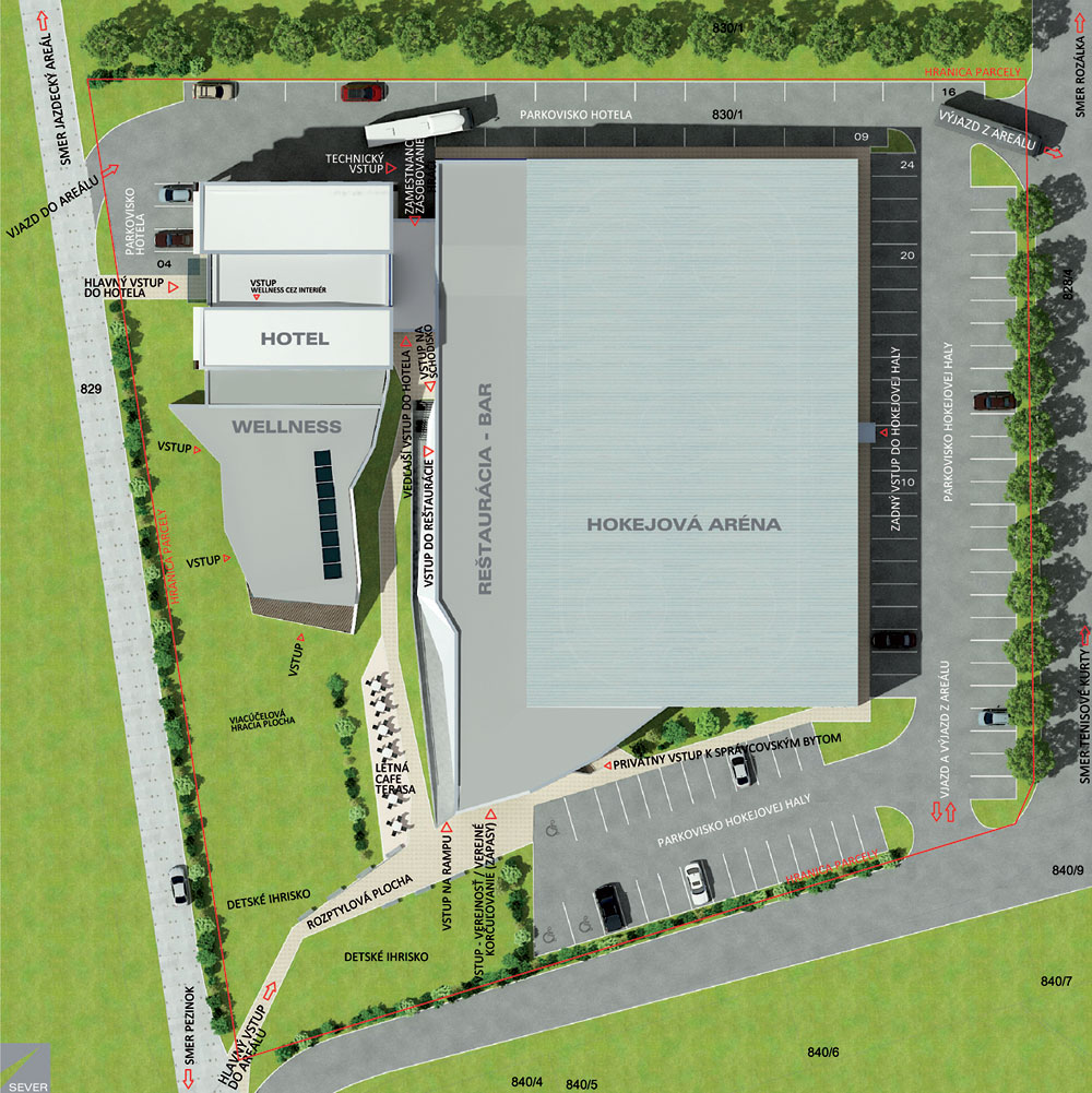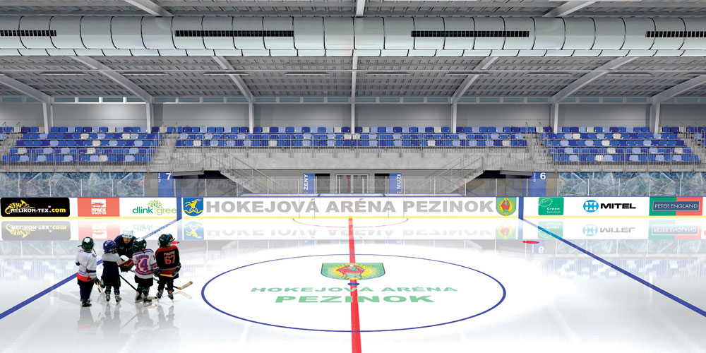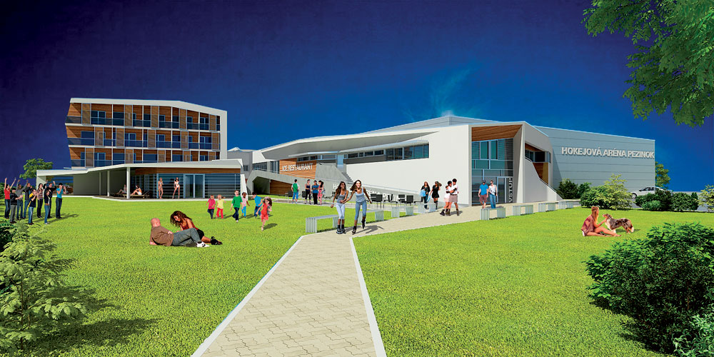 | Hokejový štadión, Pezinok Miesto: Suvorovova ulica, Pezinok–Rozálka Autor: Rusnák architects spol.s.r.o., Hrnčiarska 12, Modra, Ing. arch. Marian Rusnák Stupeň dokumentácie: Architektonická štúdia – investičný zámer Hokejová hala vrátane príslušenstva 942 m2 Hotel 305 m2 Wellness 415 m2 Zastavané plochy spolu 3 662 m2 Plocha pozemku 9 156 m2 Obostavaný priestor spolu 31 900 m3 |