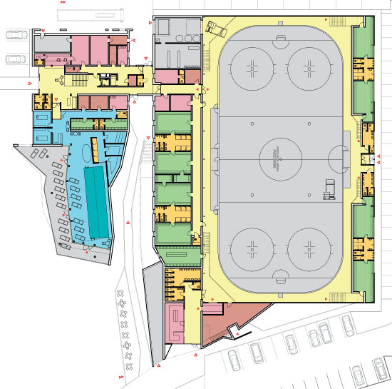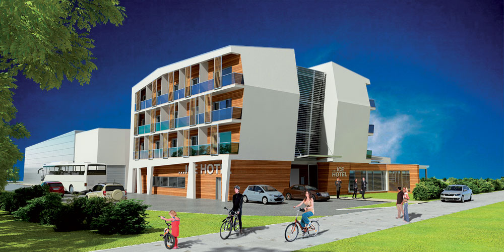 Architektúru všetkých objektov zjednotil autor architektonickej štúdie konceptom ľadovej kryhy. Pohral sa s plochami a prepájaním objemov, zároveň však nepravidelné tvary disciplinovane necháva v jednoduchej geometrii. Podarilo sa mu tak zosúladiť a pospájať všetky prevádzky do logického celku. Motív kryhy navyše vtipne ponúka rôzne veľké markízy a zastrešené trasy, čím sa prevádzka areálu stáva pohodlnejšou. Ľadový plášť predurčil aj farebné riešenie fasád. Snehová biela nepotrebuje nákladný komparz, navyše, necháva prirodzene vyznieť kovový plášť hokejovej haly. Aby súbor nepôsobil príliš chladným dojmom, architekt použil na časti fasády drevený obklad, ktorý ich pocitovo zateplil. Autor mal pri výškovom a pozičnom usporiadaní hmôt na zreteli blízkosť Malých Karpát aj samotné danosti terénu a okolitých stavieb. Jednotlivé objekty sú ľahko identifikovateľné, parkovisko umiestnil logicky na severnú neatraktívnu stranu pozemku, vstupy pre návštevníkov haly sú z juhu od centra Pezinka, do hotela a wellness časti sa vchádza zo západu. Samotná hala s hracou plochou 56 x 26 m je navrhnutá v zmysle stanov a pravidiel SZĽH vrátane pravidiel IIHF. Nachádza sa v severnej časti pozemku, aby bolo možné dosiahnuť ideálne tepelnotechnické parametre. Divákom budú k dispozícii dve tribúny s celkovou kapacitou 510 miest na sedenie a asi 200 miest na státie okolo ľadovej plochy. Okrem šatní so zázemím pre športovcov aj pre korčuľujúcu verejnosť, bufetu a kaviarne s reštauráciou s výhľadom na ľadovú plochu je do lokalitného programu zakomponované aj fitness centrum, wellness centrum s bazénom a dva správcovské byty alternatívne využiteľné ako kancelárie. Hokejová hala, fitness centrum, wellness centrum, bazén a reštaurácia sú vzájomne interiérovo prepojené, zároveň prevádzkovo oddeliteľné. Spolu s exteriérovými viacúčelovými športovými plochami, ktoré budú realizované pri hlavnom vstupe do areálu, tvoria ucelený športovo-rekreačný celok. Architekt na konštrukciu haly zvolil jednoduchý oceľový nosný systém so zastrešením z trapézových plechov a kingspanovou fasádou. Hotelová časť a welness sú prevažne železobetónové.