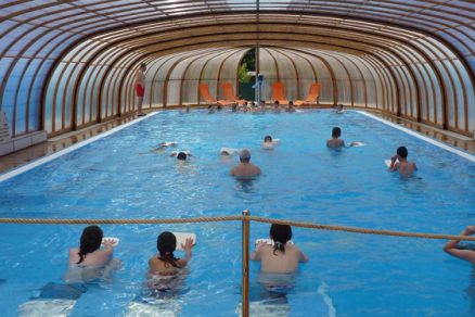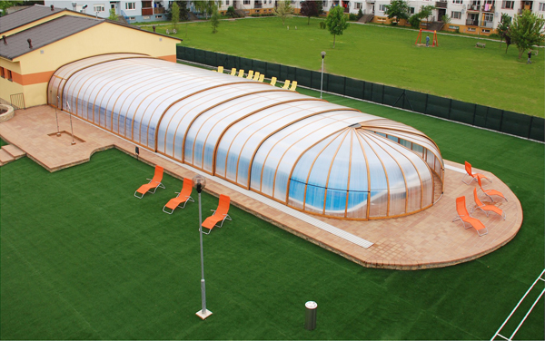 Stavba sa nachádza na voľnom priestranstve na mieste bývalého tréningového futbalového štadióna v blízkosti viacpodlažných bytových domov. Na okolie nepôsobí rušivo a je v súlade s územným plánom obce. Celý komplex tvoria prevádzková budova s podzemnou a nadzemnou časťou a bazénová časť s odsúvateľným prekrytím. Na prvom nadzemnom podlaží sa nachádza administratíva, predajňa, šatne s prezliekarňami, bufet – bar s letnou terasou, recepcia a ovládanie bazénových atrakcií. V bazénovej časti napojenej na prevádzkovú budovu je relaxačno-plavecký bazén vybavený bazénovými atrakciami. V podzemnej časti sa nachádza fitnescentrum s vlastnými šatňami a hygienickými zariadeniami, posilňovňa a strojovňa.Zaujímavosťou stavby je technologická novinka – vykurovanie a chladenie tepelným čerpadlom, ktoré má päť funkcií – ohrieva bazénovú vodu, vykuruje prvé nadzemné podlažie a podlahu pod bazénom nízkoteplotným podlahovým vykurovaním, vykuruje prvé podzemné podlažie v strope, v zime vykuruje a v lete chladí prekrytie bazéna a pripravuje 3 000 litrov teplej vody. Toto riešenie má spoločnosť patentované a získalo aj viacero ocenení. „Technológie bez obnoviteľných zdrojov, bez stabilnej výkonnosti a tie, ktorých vedľajším produktom sú emisie, nemajú budúcnosť. Tá je v geotermálnej energii,“ hovorí inžinier Michal Bartko, generálny riaditeľ spoločnosti Intergeo.