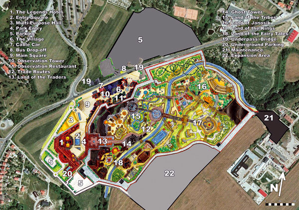 Idea návrhu rozdeľuje park na niekoľko legendárnych krajín s atrakciami, ktoré sú tematicky orientované na kultúrne oblasti Hornej Nitry, Slovenska, strednej a východnej Európy. Vyše 50 zábavných možností a atrakcií obsahuje aj rôzne špeciálne prvky – napríklad vzdelávací program poukazujúci na výnimočnosť a kultúru slovenskej histórie. Návštevníci môžu objavovať krajiny rozprávok, remesiel, kmeňov, kráľov či najznámejšieho slovenského hrdinu Juraja Jánošíka. Návrh ráta s celoročným využitím areálu. V hlavnej sezóne budú návštevníkom k dispozícii všetky vonkajšie atrakcie. Súčasťou parku je Indoor centrum, ktoré poskytne hosťom zábavu a služby v objektoch určených na celoročnú prevádzku – adrenalínové aktivity, virtuálne atrakcie a 3D kino. V severozápadnej časti parku bude zábavný areál s vyhliadkovou vežou na okolitú krajinu. Súčasťou zóny je oddychový areál s viacerými reštauráciami, kaviarňami a inými objektmi trávenia voľného času. V nadväznosti na tematický rodinný hotel sa bude nachádzať viacúčelová hala s možnosťou využitia na ľadové korčuľovanie, loptové hry, tenis, squash a koncerty populárnej hudby.