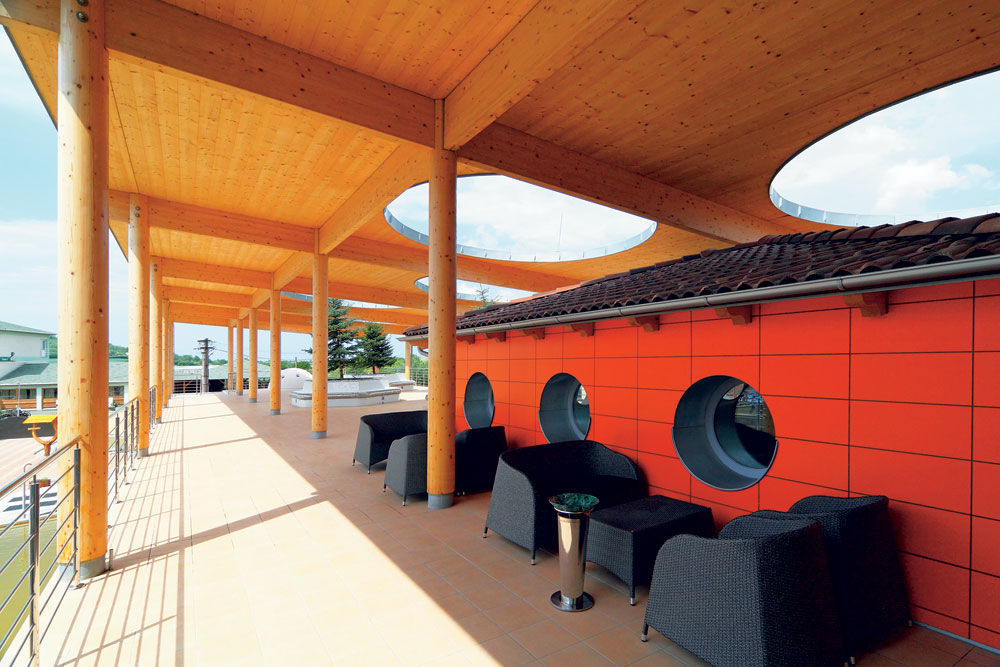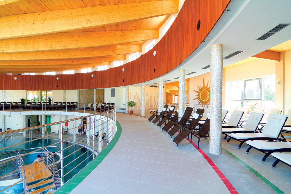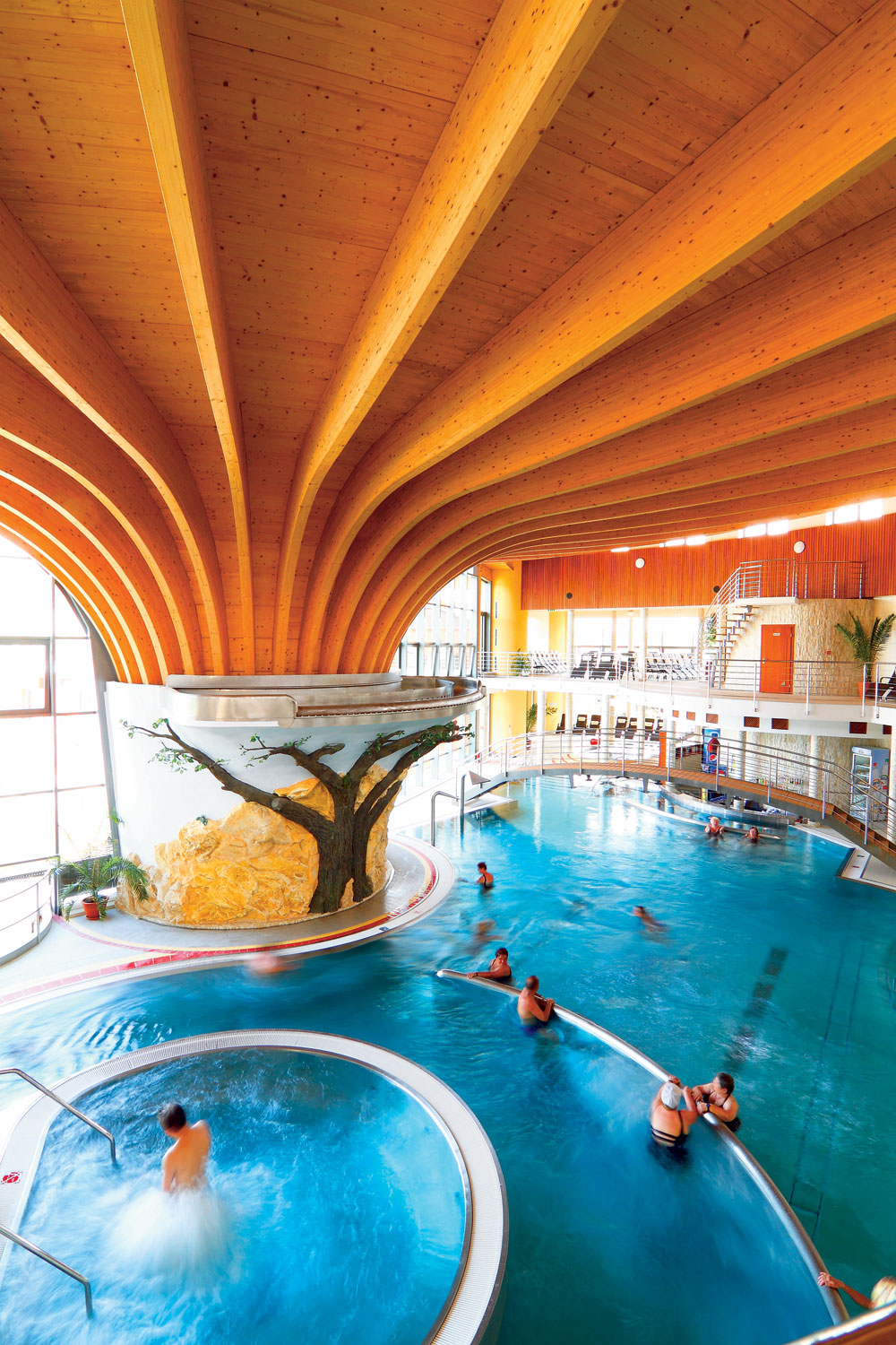 Strešná konštrukcia bazénového objektu je zaujímavá svojím hmotovým stvárnením. Ambíciou riešiteľa projektu bolo poskytnúť návštevníkovi počas chvíľ liečby a relaxu aj architektonický zážitok. Pôdorysne ju tvorí vyše 180° výsek kružnice. Strecha je pultová, zbiehajúca do stredu kružnice vo forme priznaného mohutného lievika. Nosnú konštrukciu strechy tvoria masívne drevené lepené väzníky.