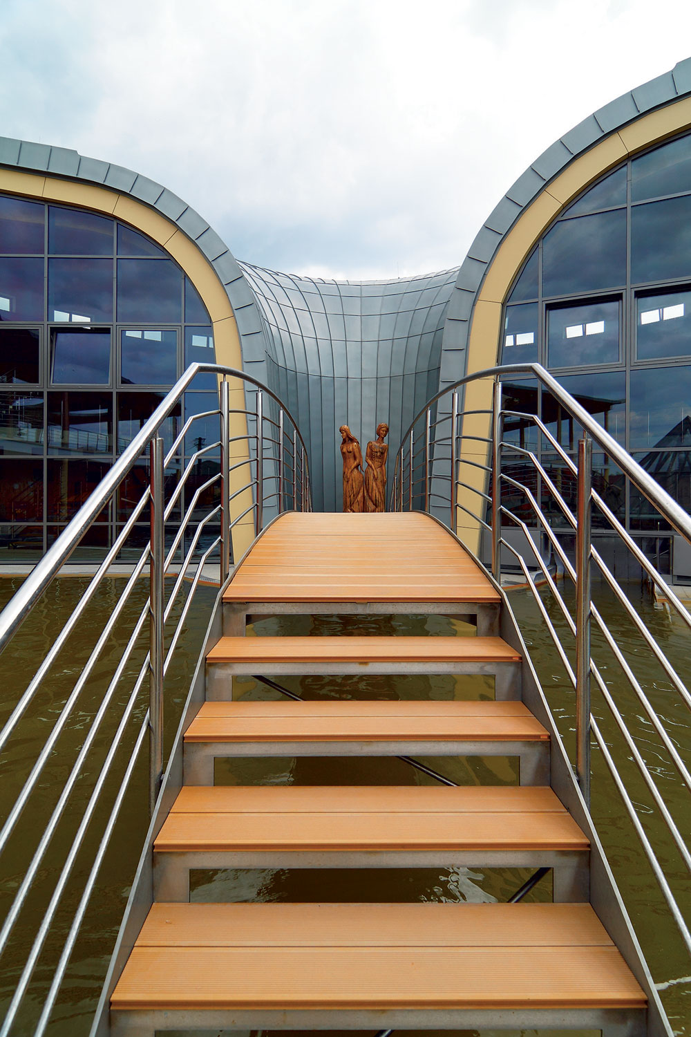 Divadelný zážitokDivadlo je umením o bezprostrednom zážitku okamihu umenia aktérov v priestore. Architekt Ladislav Bakša stavil na tento vzťah, ktorý má rozmanité scény. Pre návštevníka Wellness centra Aquamarin pripravil niekoľko rafinovaností, ktorými si neustále vyžaduje jeho pozornosť. Ako to dosiahol? Stavil na ľudskú zvedavosť. Návštevník ešte ani neopustí priestor šatní a už sa mu nad hlavou rozkladá zasklené jazierko s rybami, ktoré evokuje akvárium. Následne otvára dvere do centrálneho priestoru a pred ním sa rozprestiera takmer až divadelná scenéria. V strede vyrastá symbolický strom – vodopád, ktorý tvorí nosný pilier celej atypicky tvarovanej strešnej konštrukcie vyhotovenej z tvarovaných lepených drevených nosníkov usporiadaných do vejárovitého tvaru. Z výšky približne piatich metrov padá voda, ktorá v pravidelnej časovej periodicite vytvára efekt vodopádu. S vodopádom sa spúšťa aj hudba a atmosféra získava akvamarínový charakter. Veľké zasklené plochy prepájajú interiér s exteriérom do spoločného priestoru, v ktorom sa odvíja život na kúpalisku. Stierajú sa rozdiely dnu – von, zostáva pocit objavenia nového rozmeru. Dokonca sa zdá, že zasklená pyramída pred objektom, ktorá ukrýva techniku spojenú s geotermálnym vrtom, je umiestnená na námestí pred vchodom do Louvru.