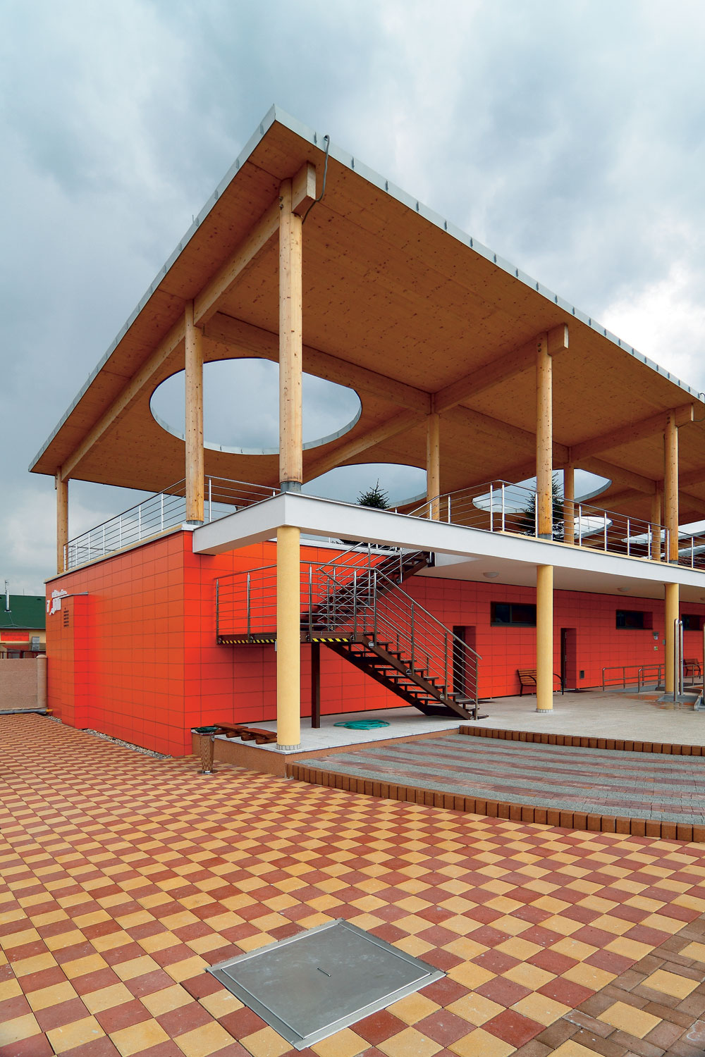 Strešná skladba – na dvojpodlažnej prístavbe sa riešila podobným spôsobom. Jej súčasťou je aj zastrešená otvorená terasa s pultovými strechami. Strechy majú otvory nad veľkými kvetináčmi, do ktorých sú umiestnené vzrastlé dekoratívne stromy prerastajúce cez tieto kruhové otvory. Časť strešnej krytiny nad bazénom bolo nevyhnutné dilatačne oddeliť od fasády – lievika – z dôvodu teplotnej rozťažnosti. Zároveň sa tomu muselo podriadiť aj umiestnenie pevných a posuvných príponiek.