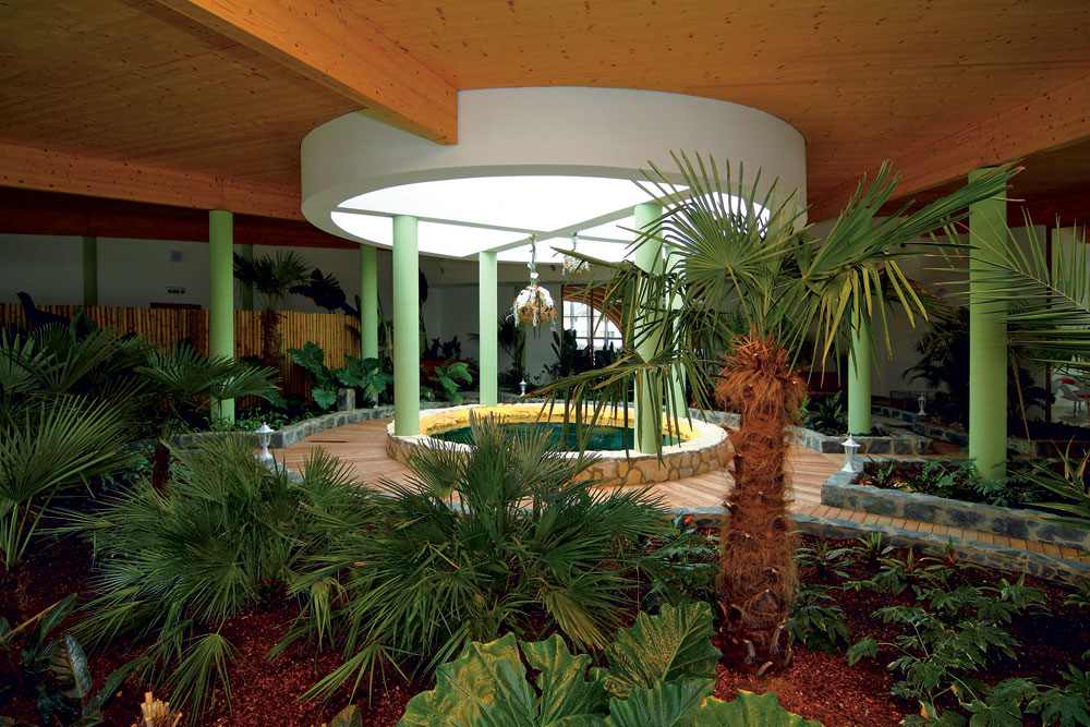 Ústrednou časťou je tropická záhrada prístupná z priestoru cukrárne a kaviarne umiestnenej nad vstupným priestorom prízemia. Tropická záhrada s hojnou zeleňou a vstavaným akváriom slúži na oddych a súčasne je aj náučným parkovým priestorom vybaveným parkovým nábytkom.