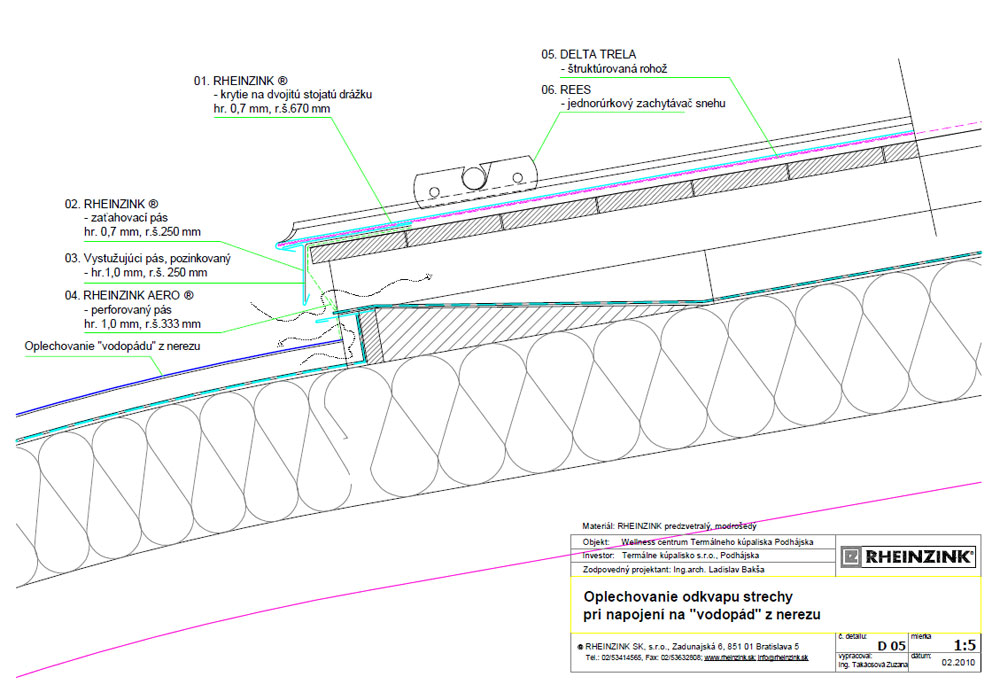Na zastrešenie objektu sa použil systém titánzinkovej strechy s dvojitou stojatou drážkou (DSD) s celoplošným tesnením spojov. Tvar strešnej konštrukcie stanovil aplikáciu kónických krytinových pásov. Ako materiál na strešnú krytinu sa použil titánzinkový plech – predzvetraný modrosivý s hrúbkou 0,7 mm, r. š. 670 – 150 mm. Na opláštenie fasády v tvare lievika sa použil materiál titánzinok – predzvetraný modrosivý s hrúbkou 0,8 mm, r. š. 570 – 333 mm. S architektom sa viedli technické diskusie ohľadom aplikácie nevyhnutných technických riešení, vždy sa však podarilo nájsť aj v detailoch prijateľný kompromis medzi architektúrou a funkčnosťou strešnej krytiny.