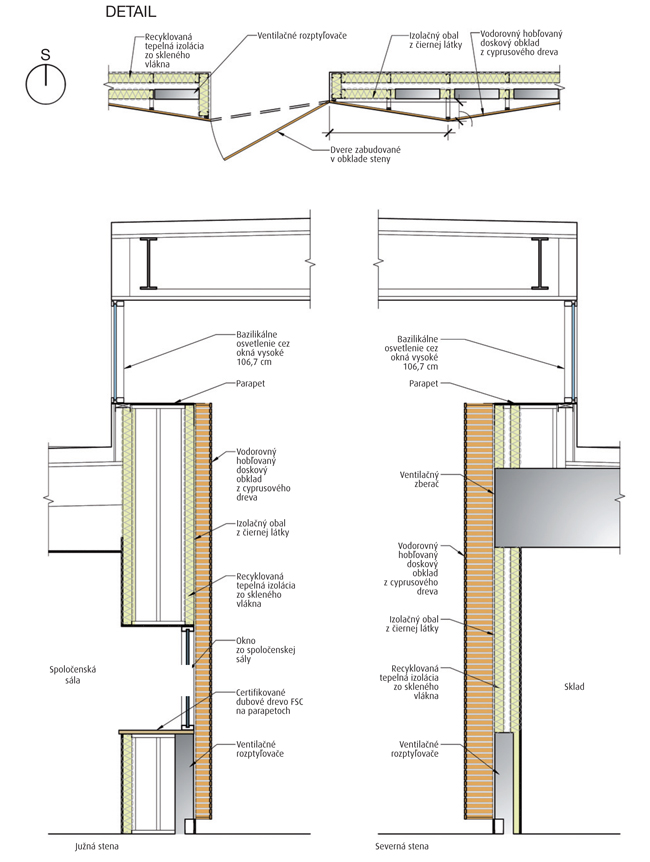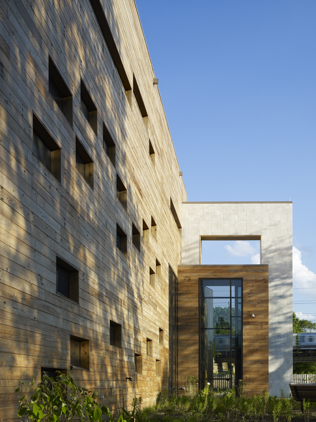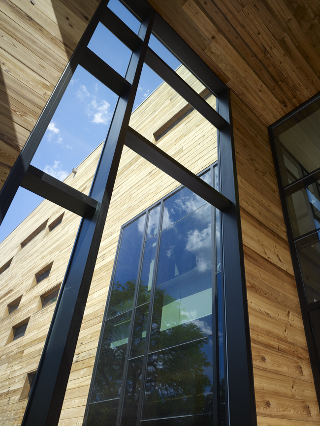 Na obklad fasády sa použilo drevo z miestnych stromov.