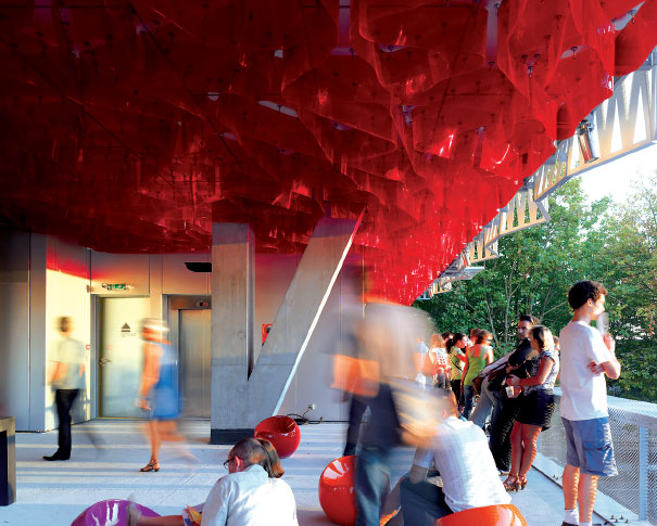 Medzi základňou z bunkra a nadstavbou zdvihnutou na konzolách vznikla terasa so stropom z červeného polykarbonátového závoja, na ktorom sa dá vidieť aj autobus – nahrávacie štúdio.