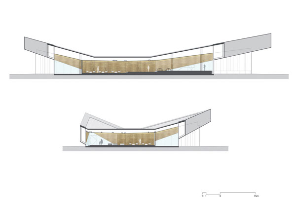 Exteriérové steny, ktoré plynulo prechádzajú do mohutnej markízy, obložili architekti obkladom Cor-ten. Zliatina medi, chrómu a ocele vynikajúco odoláva nepriaznivým poveternostným vplyvom a v jedinečnom podnebí získava originálnu patinu. Materiálovú čistotu v podobe kombinácie skla a ocele v exteriéri kontrastne dopĺňa drevený interiérový obklad. Autori ho využili na zútulnenie vnútorných priestorov.