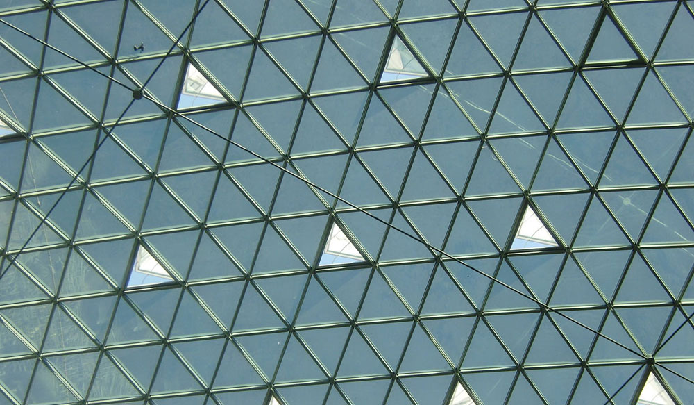 Skoro 2000 tabúľ izolačného skla sa dimenzovalo nezávisle od hlavnej nosnej konštrukcie. Sklenená konštrukcia sa skladá z hornej vrstvy, 8 mm hrubého jednovrstvového bezpečnostného skla, a z dolnej, 2 × 6 mm hrubého vrsteného bezpečnostného skla. Takto bola zabezpečená odolnosť skla proti veternej, snehovej a úžitkovej záťaži. Pomocou nanášania vhodnej vrstvy sa zredukovalo solárne ohrievanie átria, predsa je však potrebná klimatizácia.