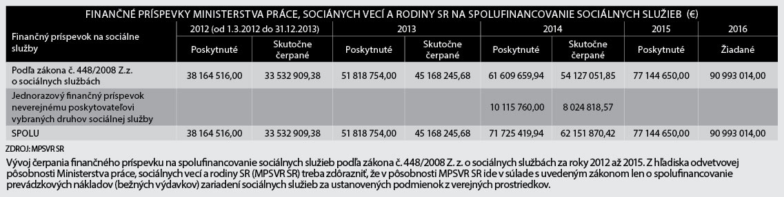 V rámci reakcie na otázku oprávnenosti kritiky niektorých inštitúcií týkajúcej sa financovania sociálnych služieb MPSVR SR pripomenulo, že práve súčasná vláda postupne zvýšila výdavky na sociálne služby, a to z 38 miliónov € v roku 2012 na 77 miliónov € v tomto roku. „Vlani bola okrem toho z rozpočtovej kapitoly ministerstva vyčlenená mimoriadna dotácia na dofinancovanie neverejných poskytovateľov sociálnych služieb v sume približne 10 miliónov €,“ uviedlo ministerstvo s tým, že na rok 2016 opätovne zvýšilo finančné prostriedky na sociálne služby zo svojho rozpočtu a finančné prostriedky sa navýšili aj zo strany VÚC. „Výsledkom nie je len výrazné zlepšenie finančného pokrytia existujúcich kapacít, ale aj zvýšenie o tisíce nových miest.“
