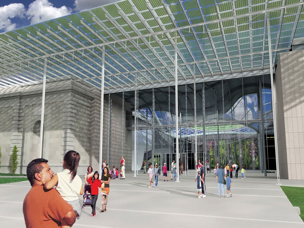 Na sklenom prístrešku, ktorý lemuje celú budovu sa nachádza pás 60 000 fotovoltických článkov.