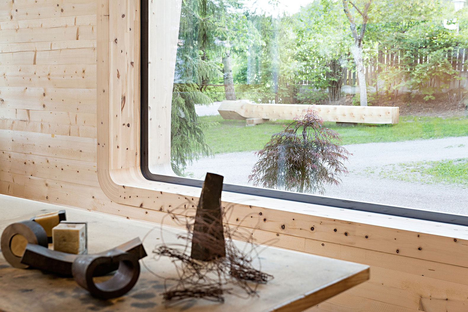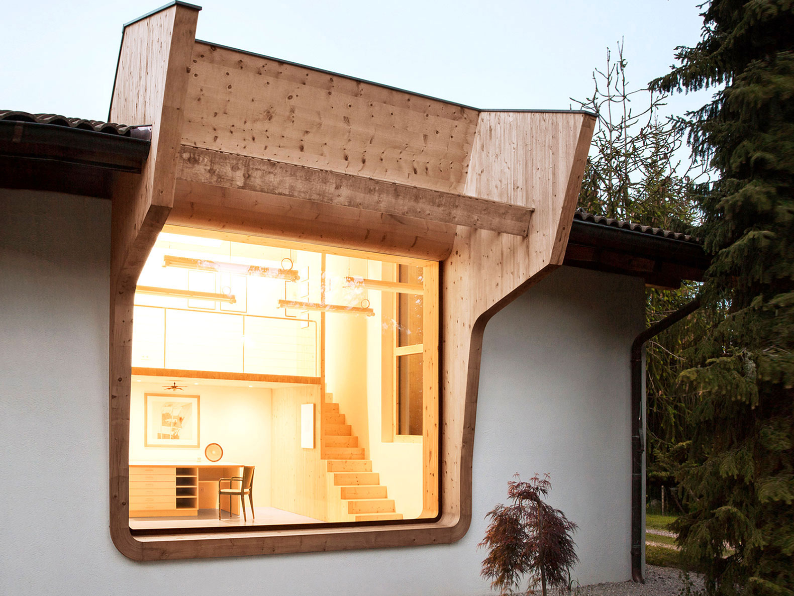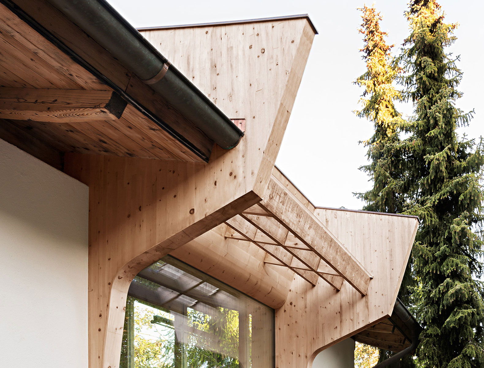 Drevené krídla vychádzajúce z okenného rámu zachytávajú svetlo a priťahujú ho do interiéru. Konštrukcia strechy je na tomto mieste akoby odhalená, pretože svetlolamy verne opisujú stavbu pôvodnej starej strechy.