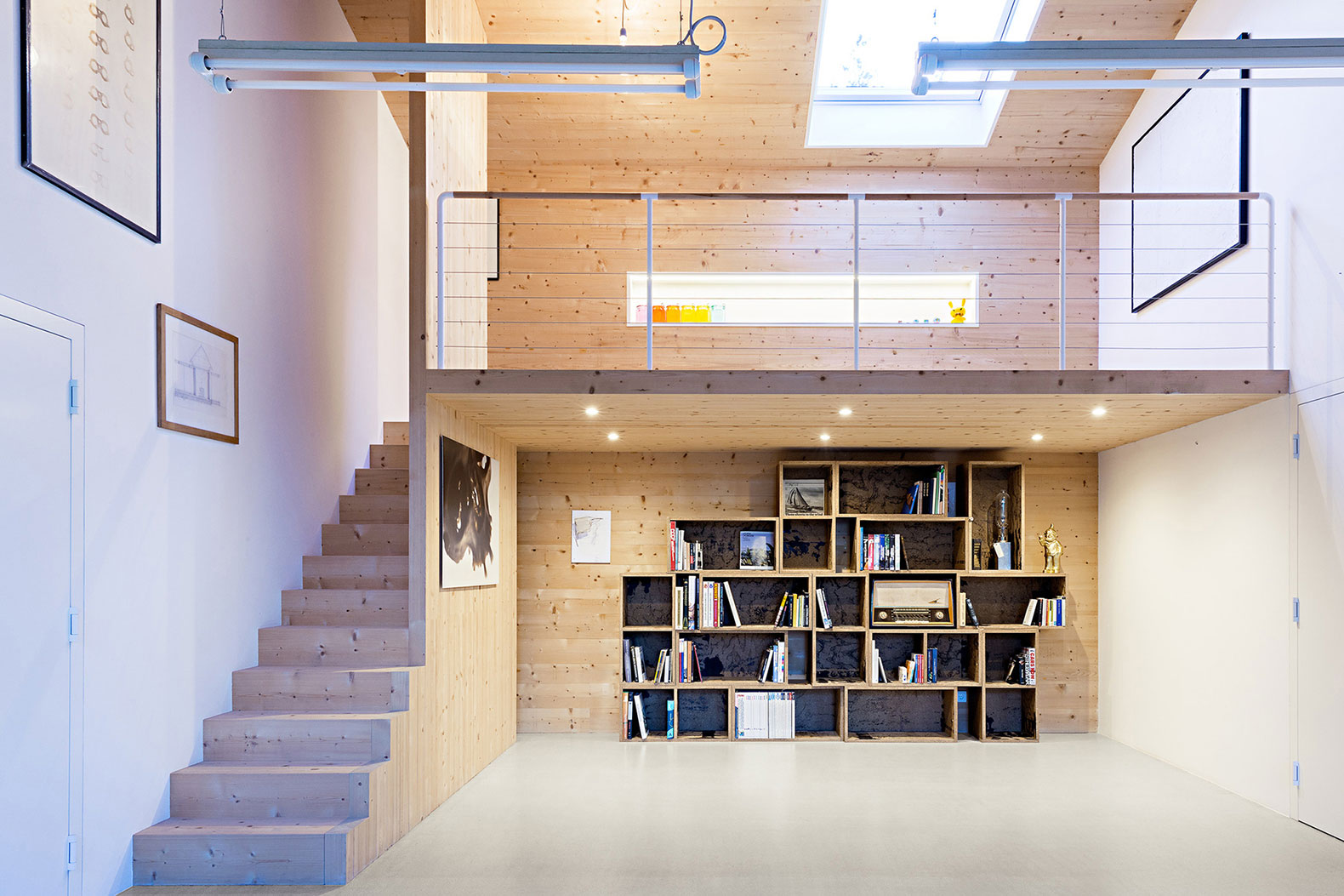 Všetky tri miestnosti sú spojené podestou na úrovni prvého podlažia. Pod podestou tak vznikol priestor na uskladnenie v drevených policiach.