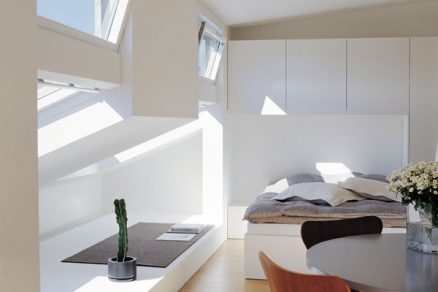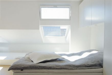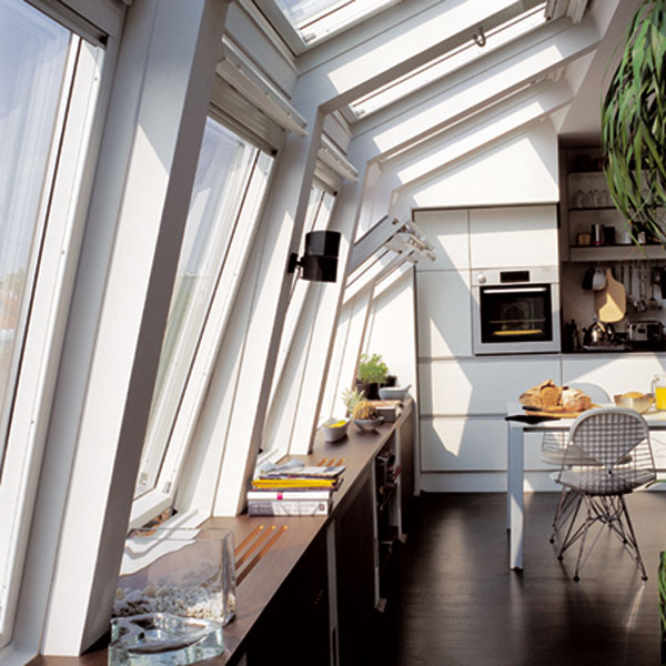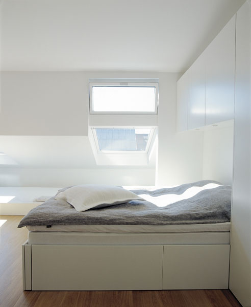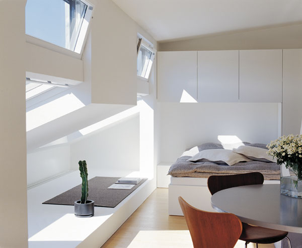 Rekonštrukcia podkrovia často ponúka architektovi veľmi špecifický priestor s tvarovými zvláštnosťami, s ktorými sa musí vyrovnať. Zaujímavé riešenie ponúkol Janne Kupiainen pri rekonštrukcii povalových priestorov bytového domu z roku 1937 v Helsinkách. Zvyčajne zažitý princíp zvislého okna umiestneného pod strešným oknom jednoducho prevrátil. Vznikla tak tvarovo veľmi zaujímavá kompozícia, ktorá privádza do vnútra dispozície dostatok denného svetla a čerstvého vzduchu a zároveň sa stáva novým dizajnovým prvkom samotného interiéru. S obmedzeným priestorom sa autor vyrovnal radou vstavaných prvkov, na zväčšenie priestoru využil svetlé farby interiéru, ktoré oživil premysleným výberom niekoľkých kusov nábytku. Celkovo tak vznikol kultivovaný priestor s rovnomerným presvetlením a bez nadmerných svetelných kontrastov.