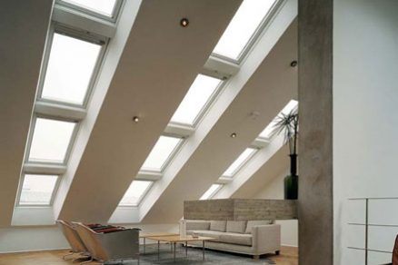 Popis: Na presvetlenie interiéru sa použili výklopno-kývavé strešné okná a zvislé doplnkové okná VELUX s bielym náterom, ktoré korešpondujú s atmosférou celého interiéru.