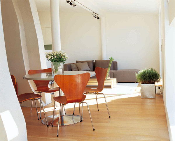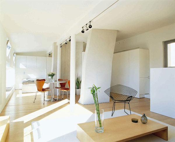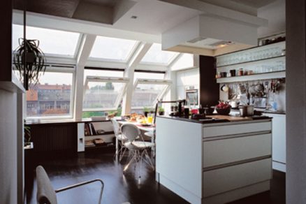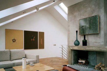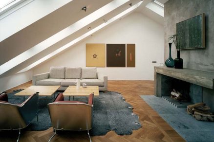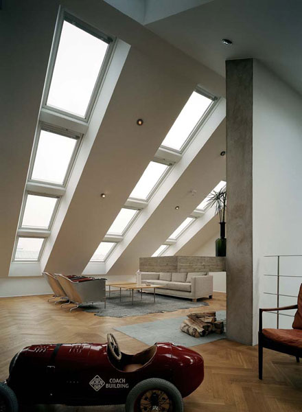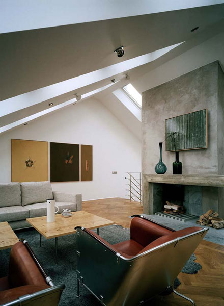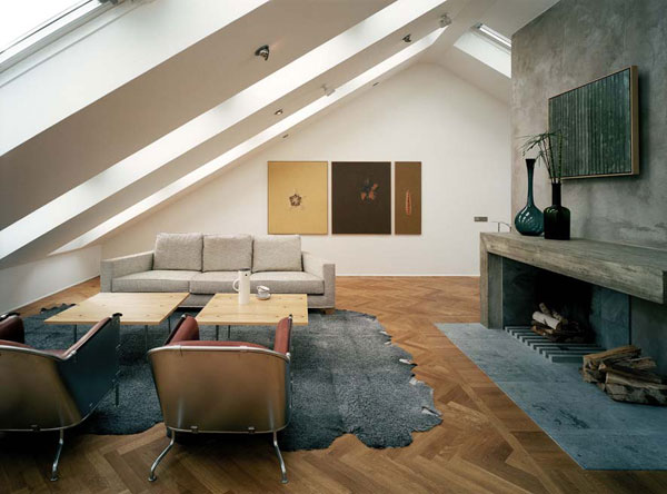 Iný pohľad na renováciu podkrovných priestorov ponúkla architektka Maria Sahlstrom. Veľkorysý priestor, ktorý rešpektuje pôvodný tvar strechy, umocnila vertikálne zoradenými zostavami strešných okien. Pásy strešných okien nielenže privádzajú do hĺbky interiéru dostatok svetla a umožňujú tak kontakt s vonkajším svetom, ale tvoria aj dominantný prvok priestoru, ktorý zdôrazňuje výškový nadštandard celého riešenia. Atmosféru luxusného a nezvyčajné bývania dotvárajú vkusné retro prvky a betónový kozub.